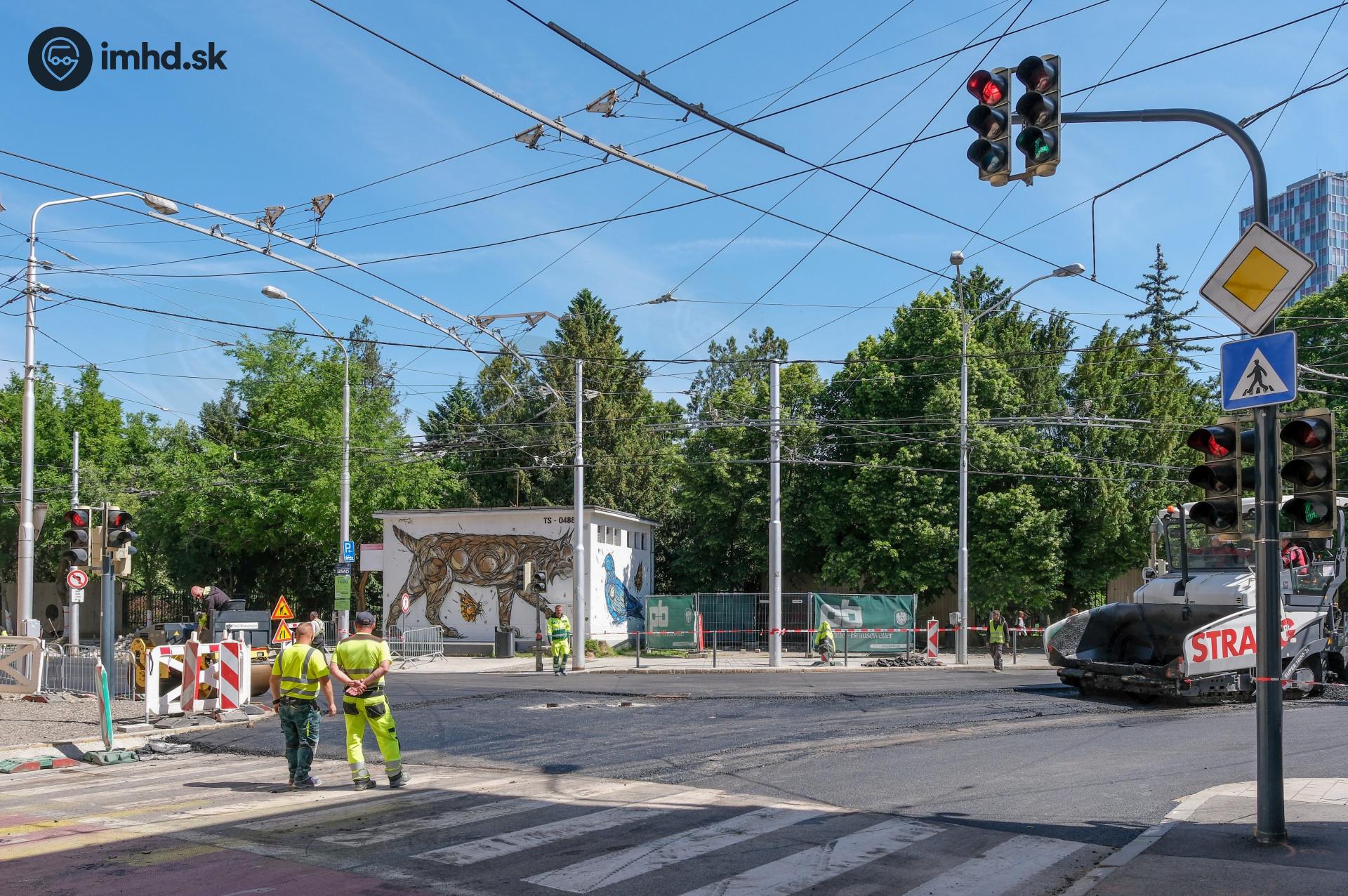 Asfaltovanie križovatky Dunajskej, 29. augusta a Mlynských nív. Nové usporiadanie jazdných pruhov si vyžiada na dvoch križovatkách aj nákladné prebudovanie trolejového vedenia zmodernizovaného v rokoch 2019 a 2020.
