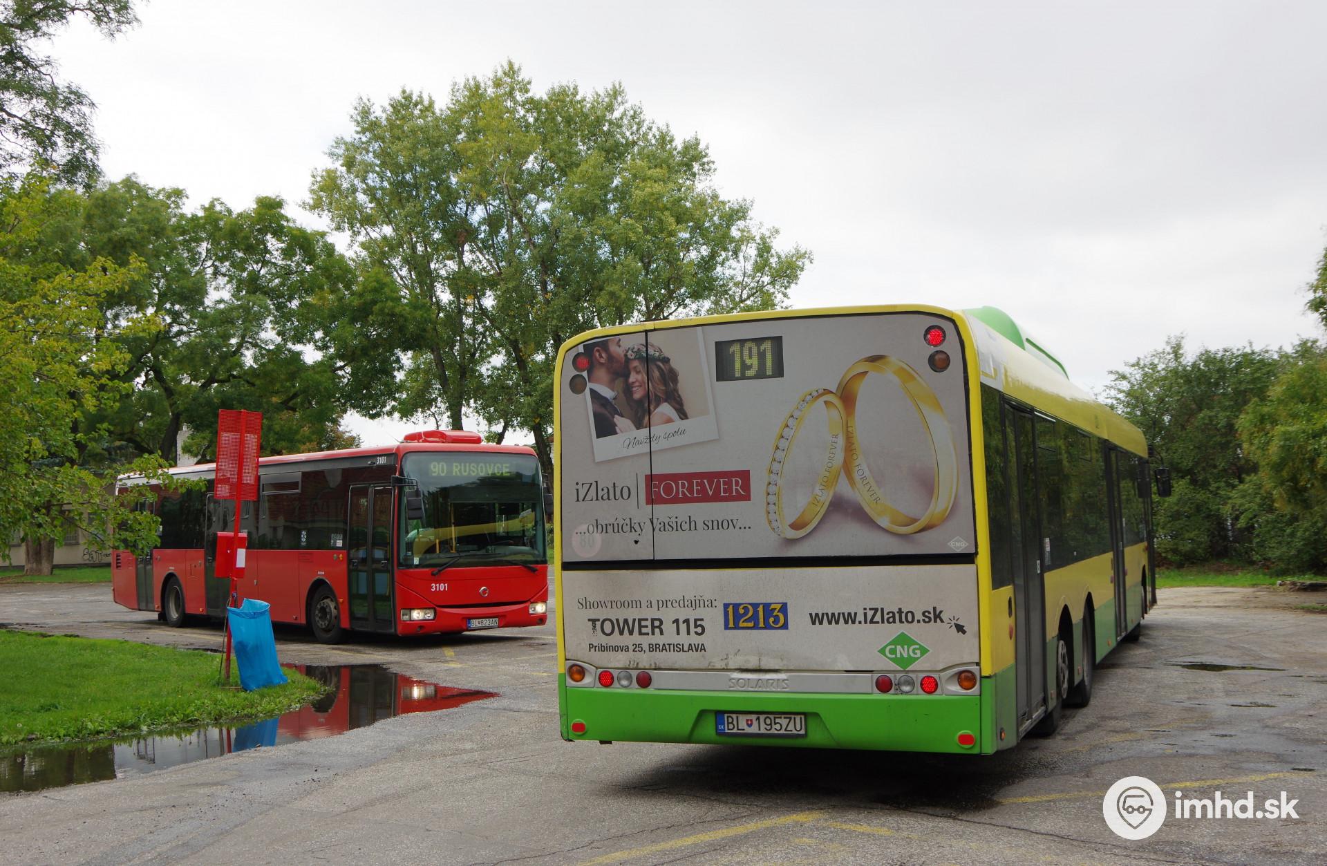 Stretnutie autobusov liniek 90 a 191 v obratisku Kaštieľ Rusovce.