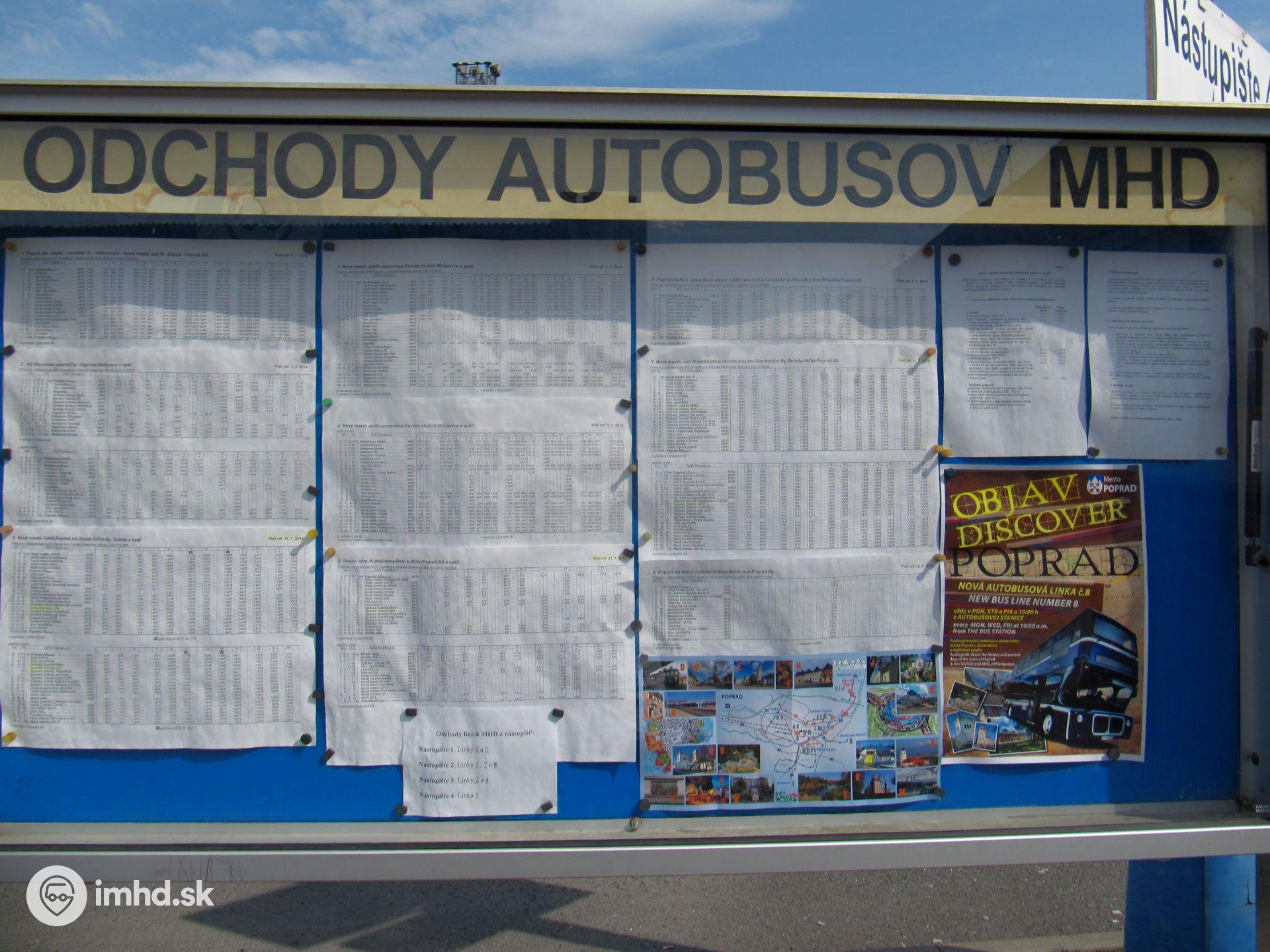 Cestovné poriadky autobusov MHD na autobusovej stanici.
