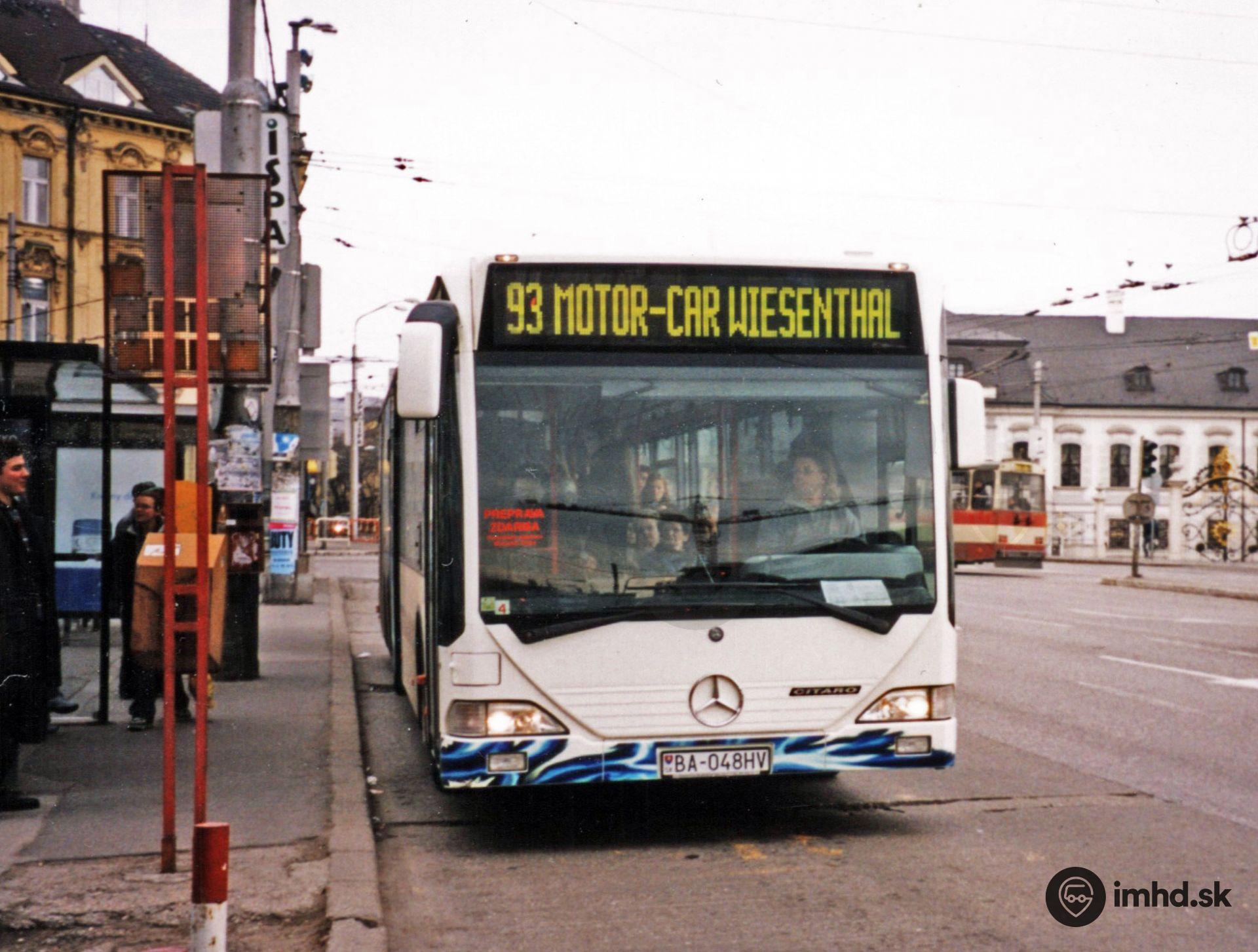 Skúšobný Mercedes-Benz O 530 L Citaro a dnes už historický pohľad na zastávku Hodžovo námestie.