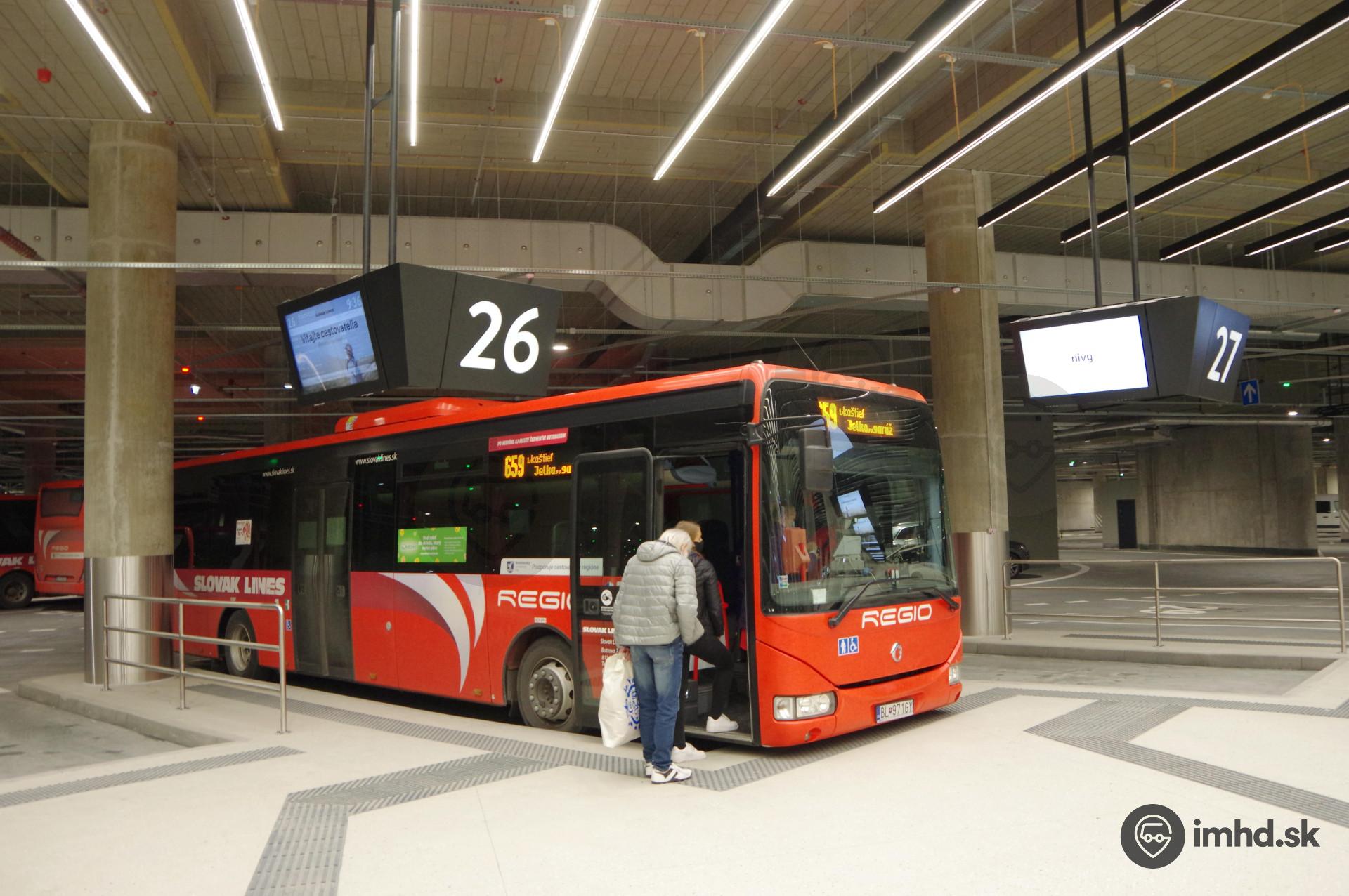 | Cestujúci nastupujú na novej autobusovej stanici do autobusu linky 659. | |