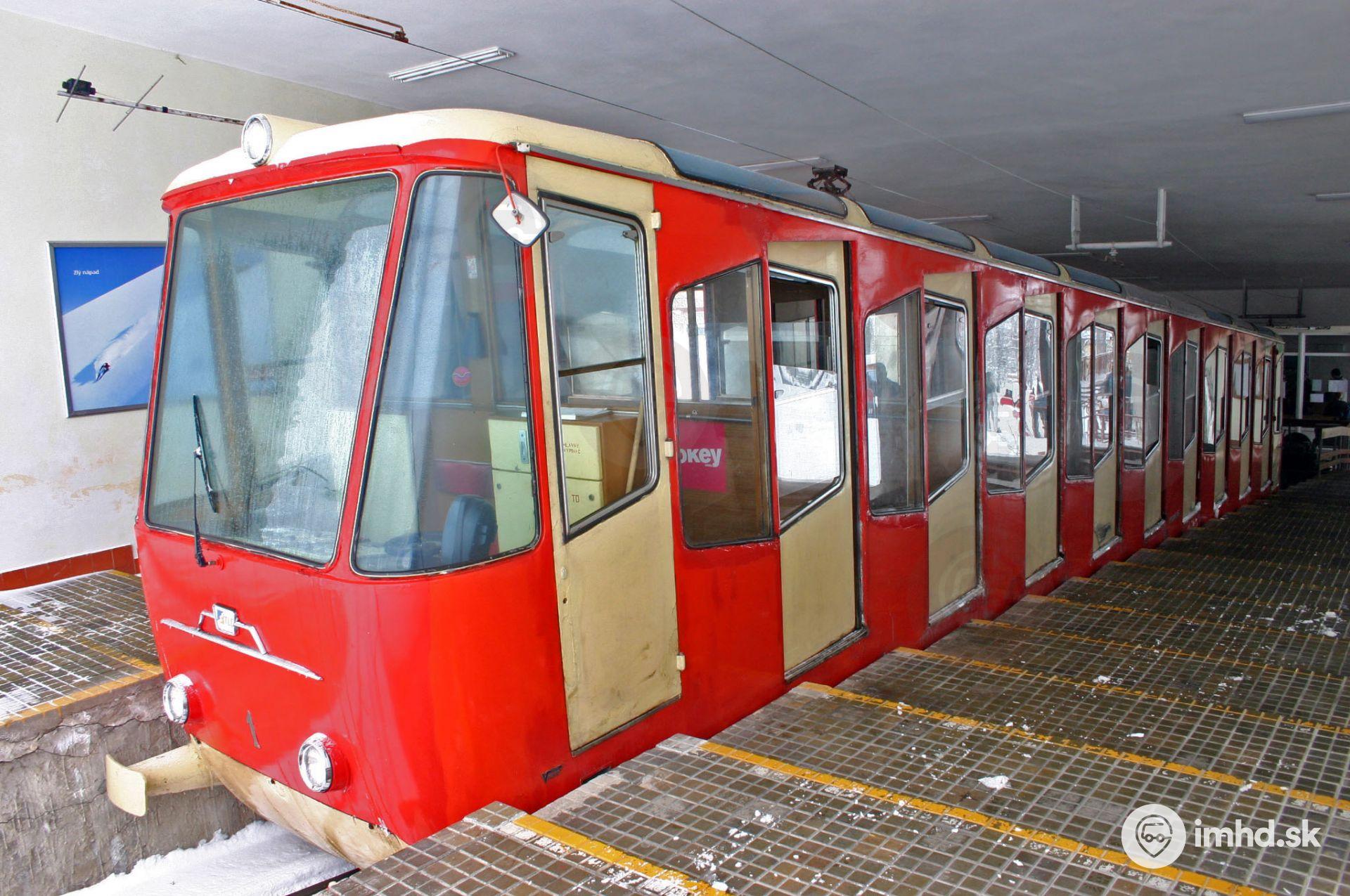 Vozeň #1 v stanici Starý Smokovec. Na fotografii vidno zberač lanovky na streche, ktorý privádza prúd z troleja do vozňa počas pobytu v stanici.