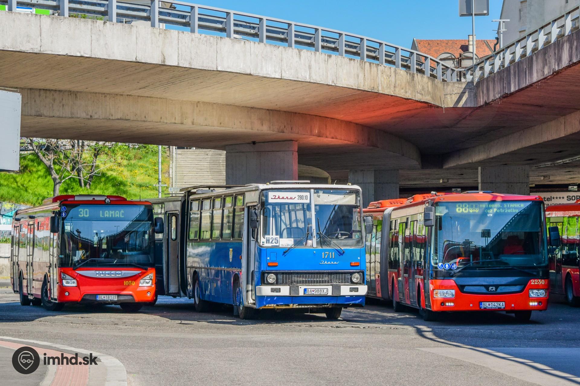 Stretnutie rôznych autobusov pod Mostom SNP