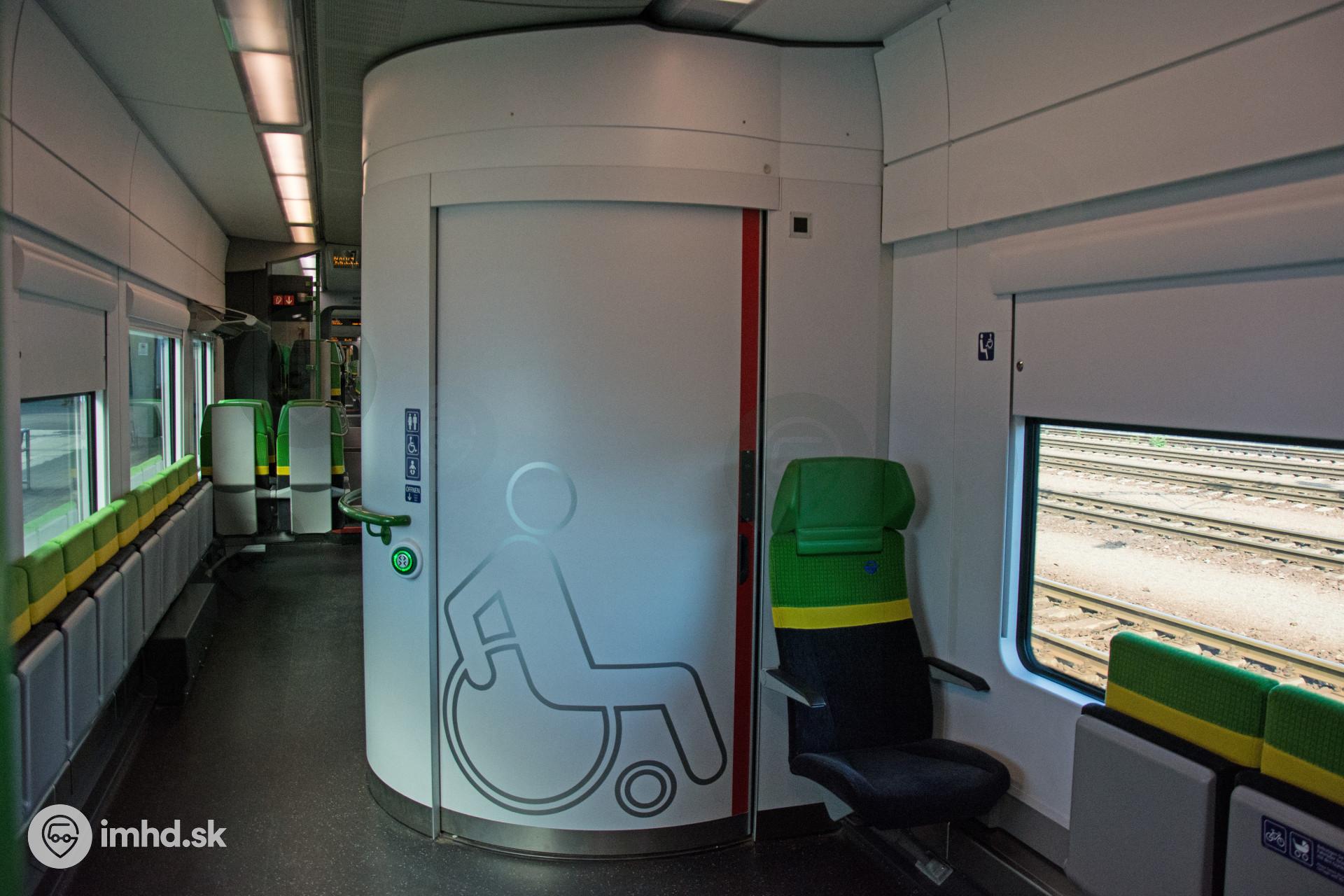 Pohľad na záchod pre imobilných cestujúcich v elektrickej jednotke Siemens Desiro ML patriacej spoločnosti GYSEV