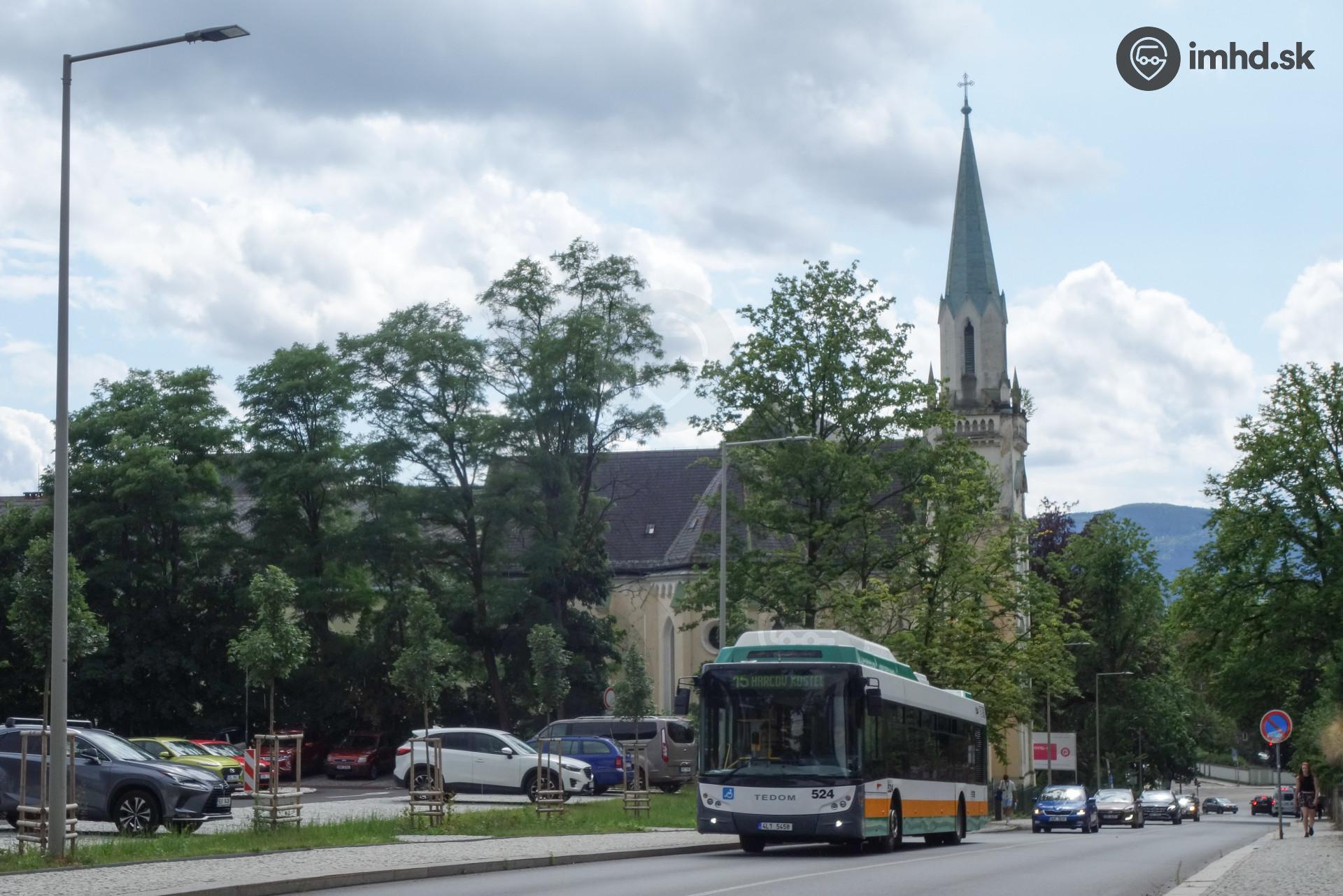 Tedom C12G #524 v stave zánovného vozidla poslušne ťahá hore Husovou ulicou pod vedením posledného vodiča týchto autobusov v Liberci.