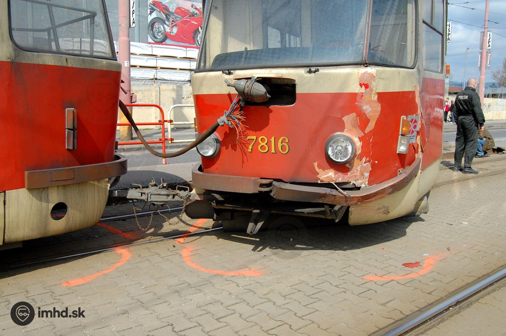 Poškodená predná časť zadného vozňa súpravy #7815+7816, ktorý po vykoľajení narazil do protiidúcej električky.