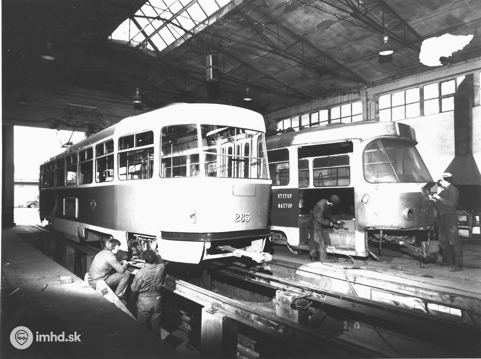druhá polovina 70-tych rokov už po zrušení funkcie sprievodcov. Jedná sa o vozy prvej série T3 z roku 1963 povodnej číselnej rady 243-272. Tie vozy mali koženkové sedadlá 1+1, úzke vetracie okná a vpredu a naboku prevíjací široký linkový transparent. Koncové svetlá sú už premiestnené zozadu na bok. Evidenčné čísla na snímku sú už po "divokom prečíslovaní".