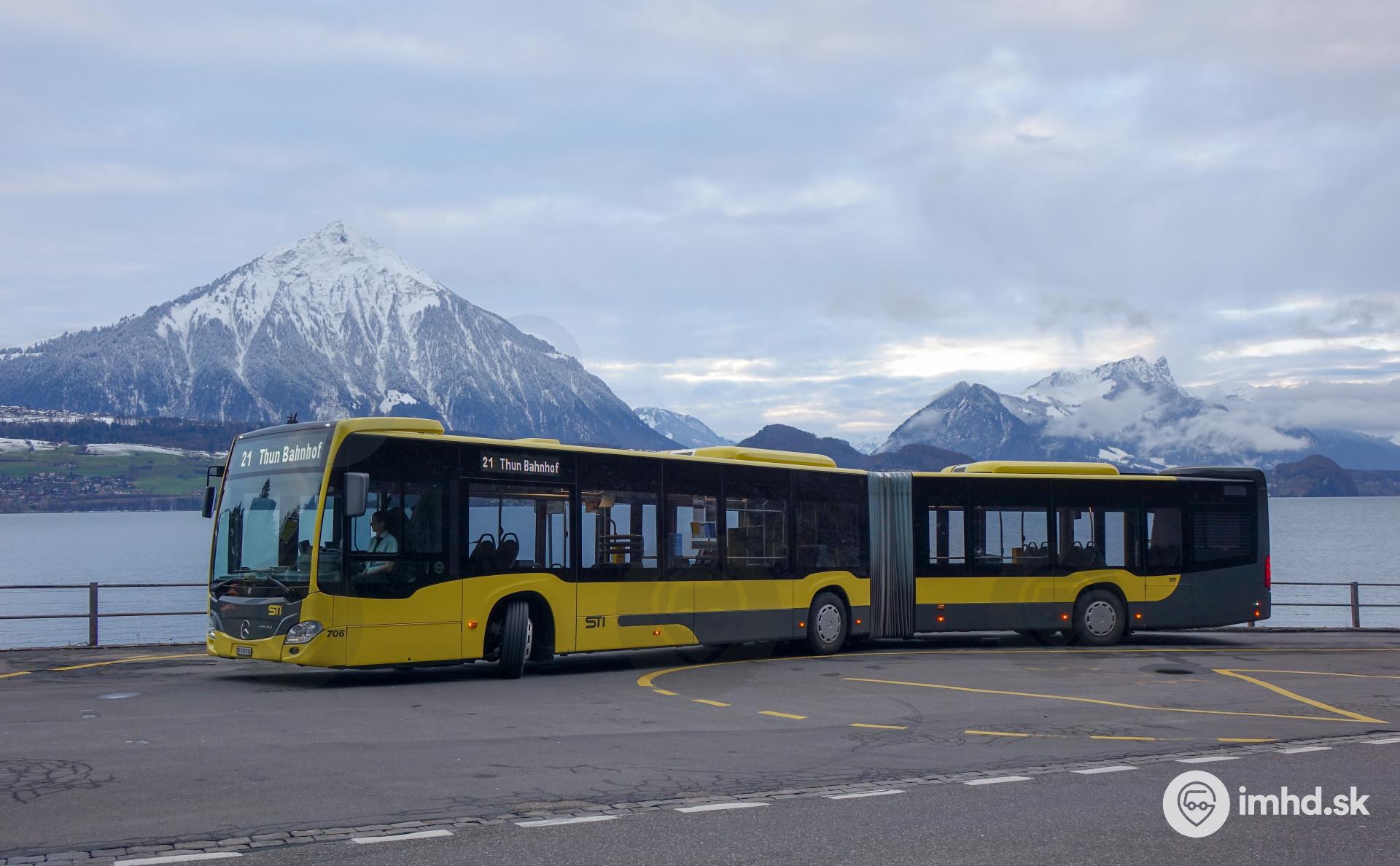 Autobus linky 21 čaká na prestup cestujúcich z lanovej dráhy a pri tom si užíva pohľad na vrchol Niesen.