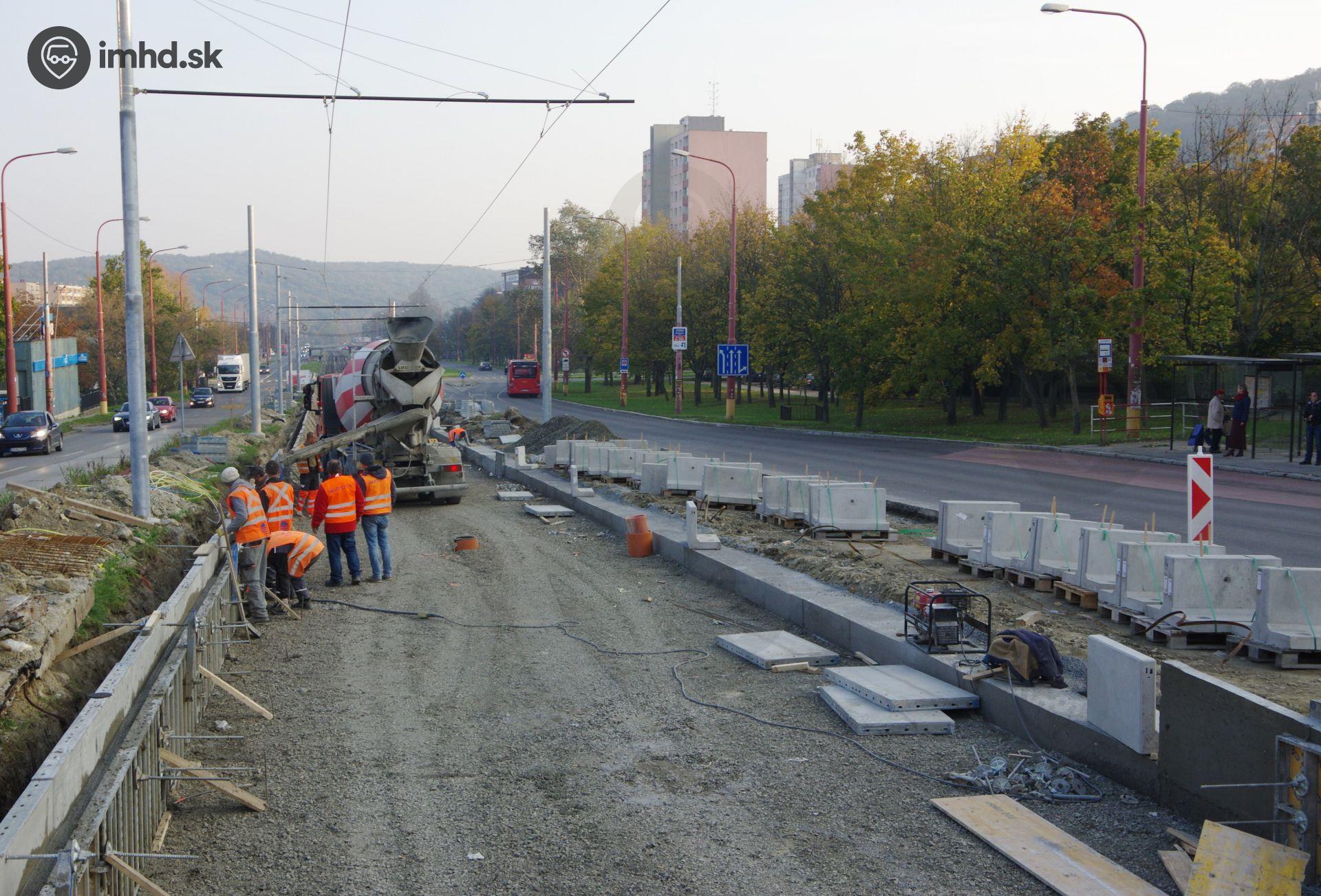Betónovanie okrajov električkovej trate.