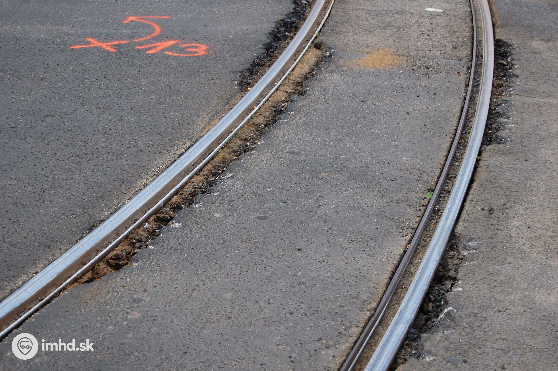 Oprava električkovej trate v oblúku z Radlinského ulice na Ulicu Imricha Karvaša spočívala aj v rozbití vystúpených častí asfaltu bez opätovného opravenia.