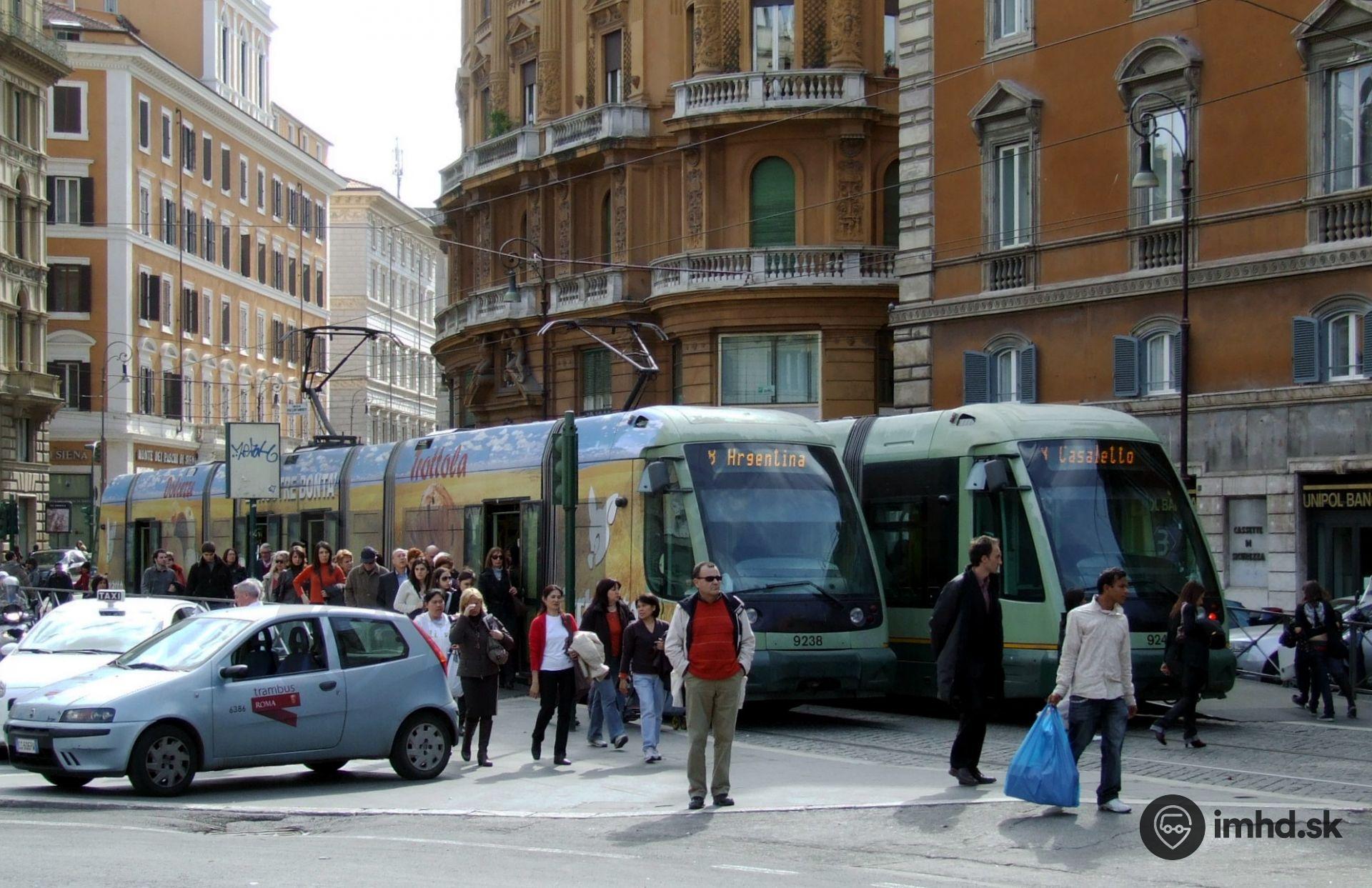 Električky Fiat Roma-II pri konci linky 8 na ulici Via Torre Argentina.