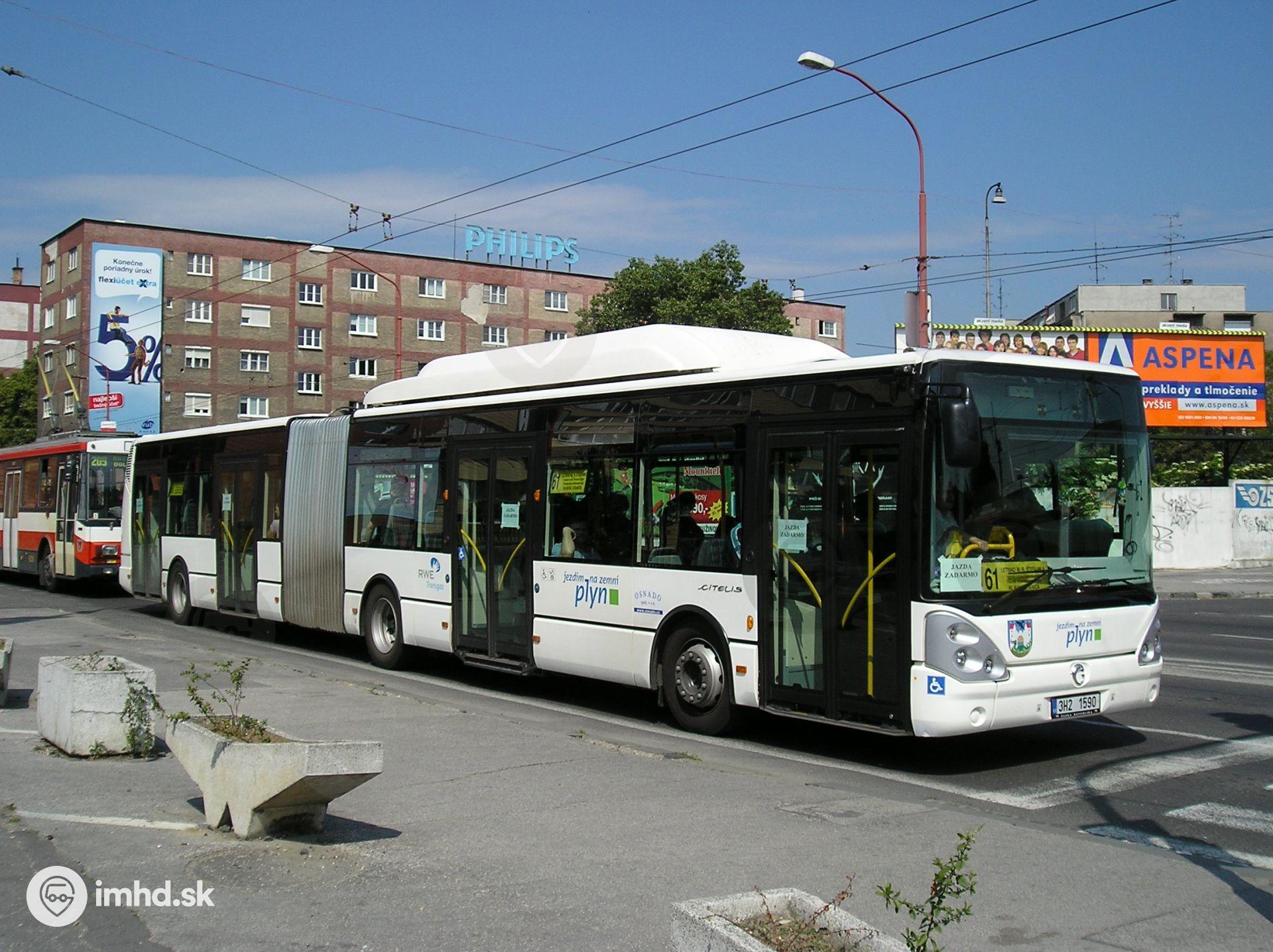 Irisbus Citelis 18M CNG stojí pred svetelne riadeným prechodom pre chodcov pred zastávkou Trnavské mýto.