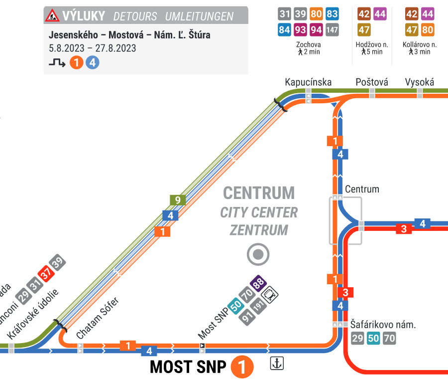 Výluka električiek na Jesenského v 8/2023.