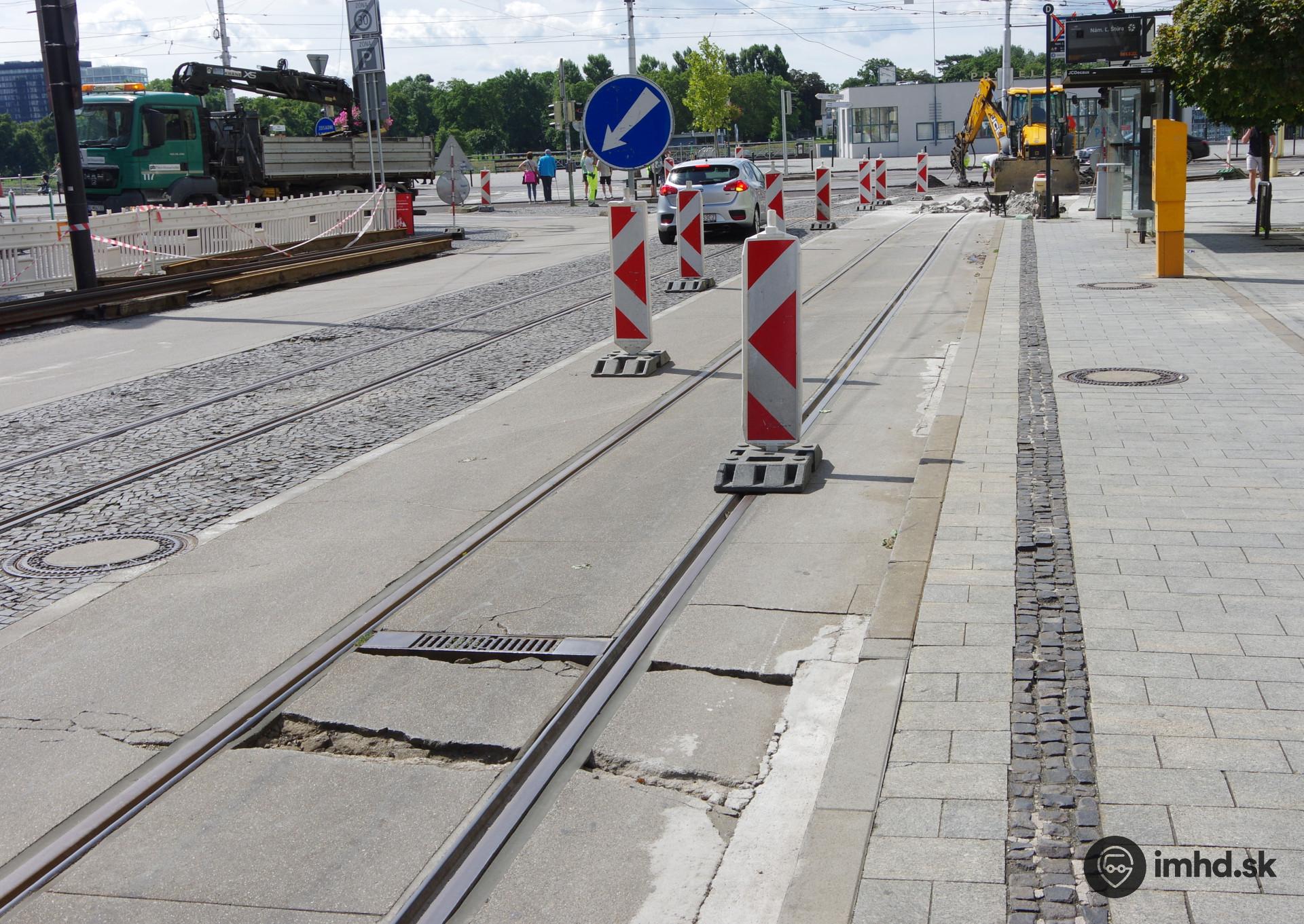 | Rozbitý povrch trate na zastávke Nám. Ľ. Štúra. | |