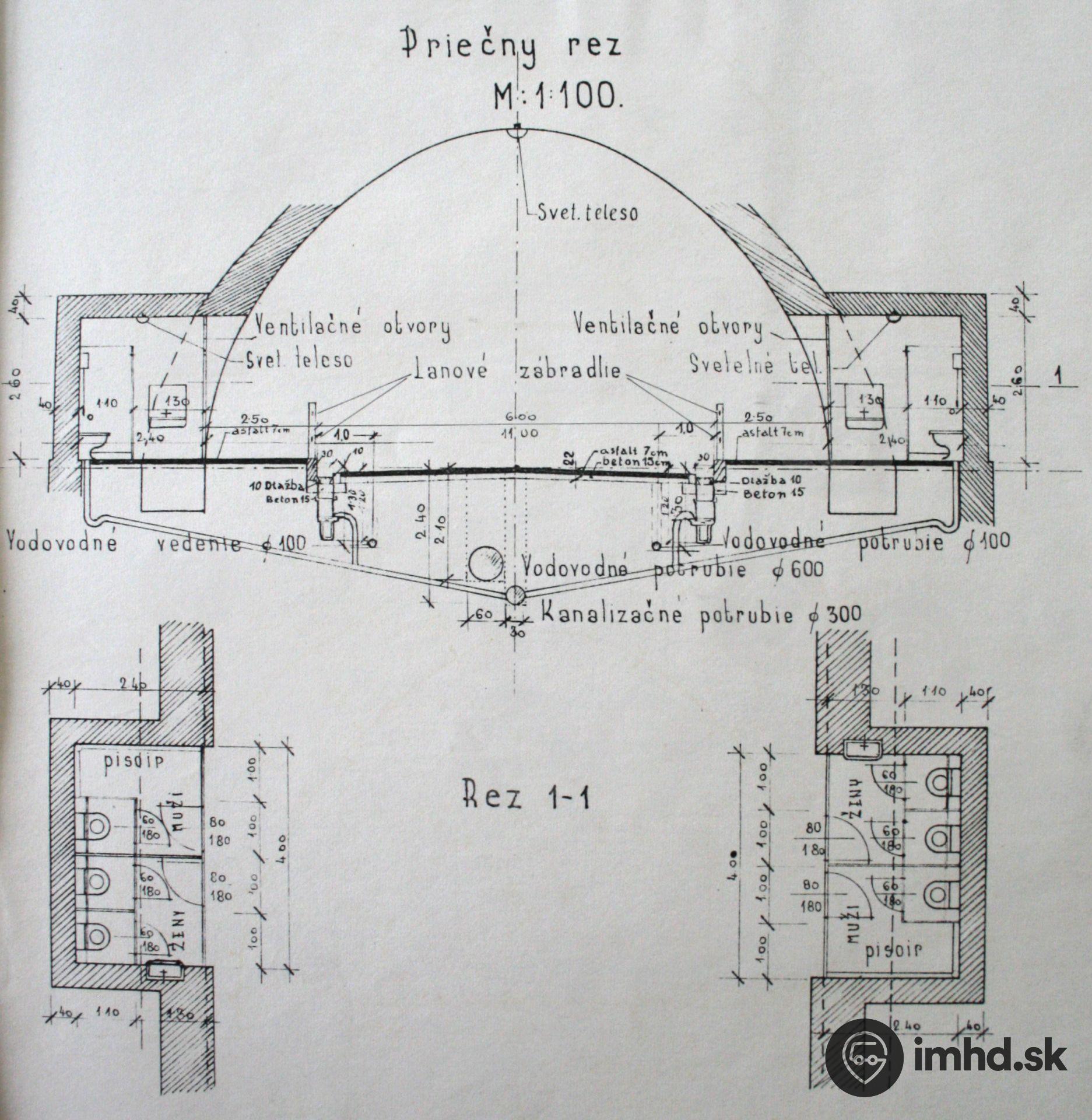 Priečny rez tunelom s plánovanými toaletami vo výklenkoch, ktoré mali byť každých 30 metrov oproti sebe. Vybudovalo sa však len niekoľko dvojíc výklenkov a po vojne sa od budovania ďalších, ako aj toaliet, upustilo.