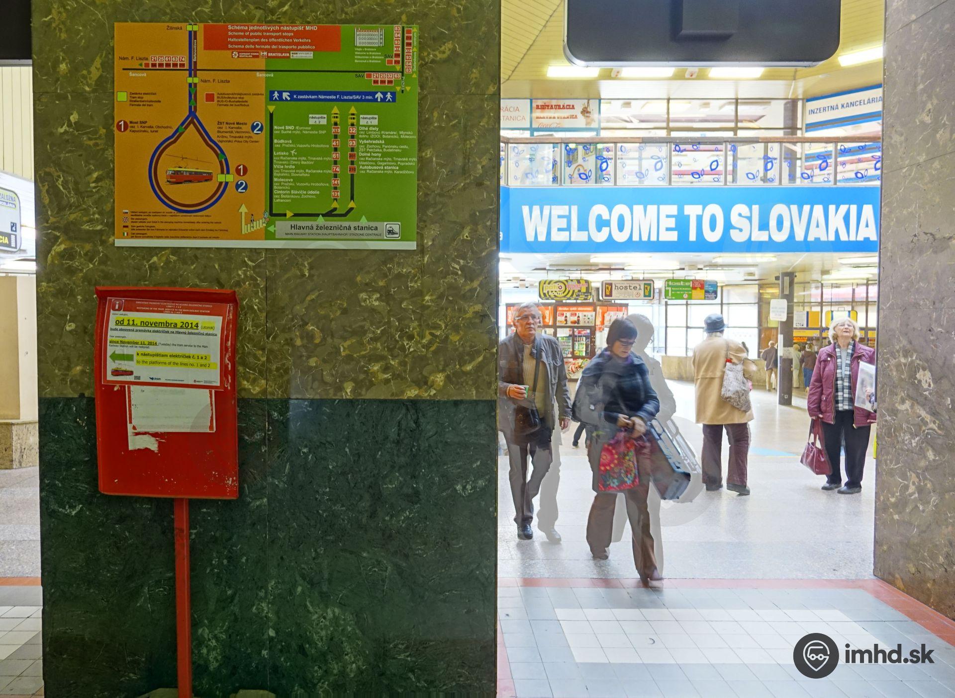 Schéma predstaničného priestoru s informáciou o obnovení premávky električiek vo vestibule Hlavnej stanice.