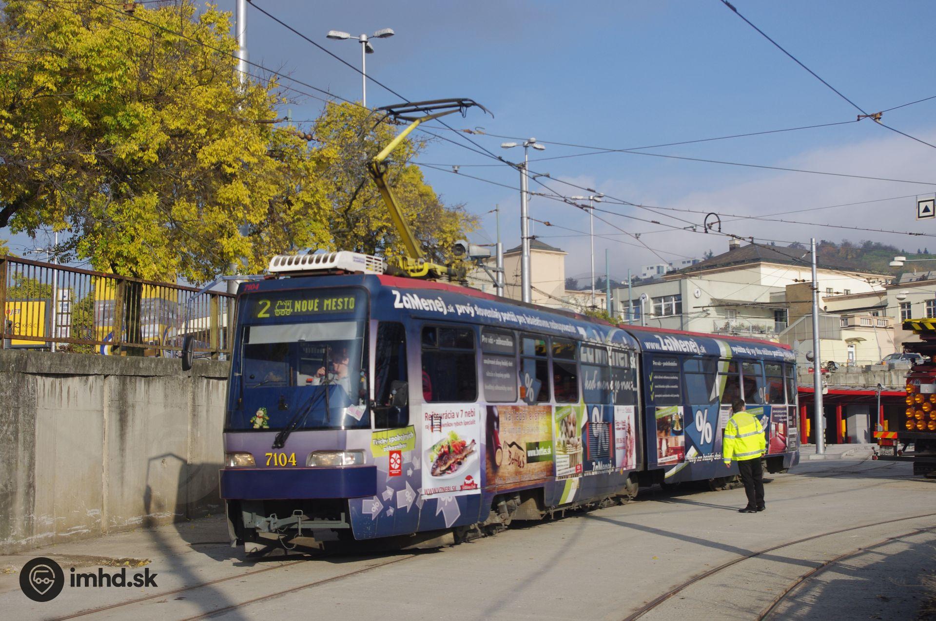 #7104 opúšťa čiastočne zrekonštruované obratisko Hlavná stanica v prvý deň prevádzky električiek na trati Radlinského - Hlavná stanica po vyše 3 rokoch.