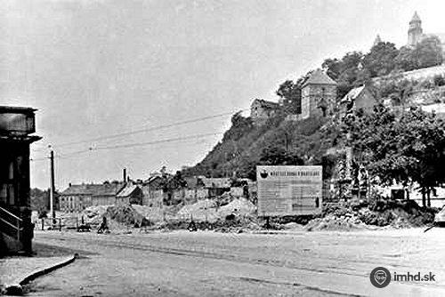 Čo bolo na hradnom kopci? Trať ostala jediná čo všetko prežila. Ja som myslel hneď za traťou že tam stále nič nieje, vlastne ak prejdete cestu tak idete na kopec (ten u-club) vy asi budete skôr poznať ako bunker no dnes je to diskotéka a v týchto miestach čo je na fotke chodíme pešo hore ku vchodu. Vlastne hneď za mostom SNP... Pod mostom sú autobusy a odtial je to pár krokov na tie miesta čo vidíme na tejto fotke. Tie domčeky tam niesu že?