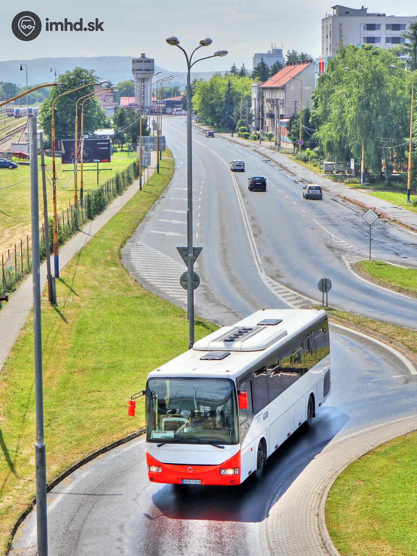 Irisbus Crossway 12M #HE-010BA prechádza okružnou križovatkou v blízkosti centra mesta cestou do Jasenova.