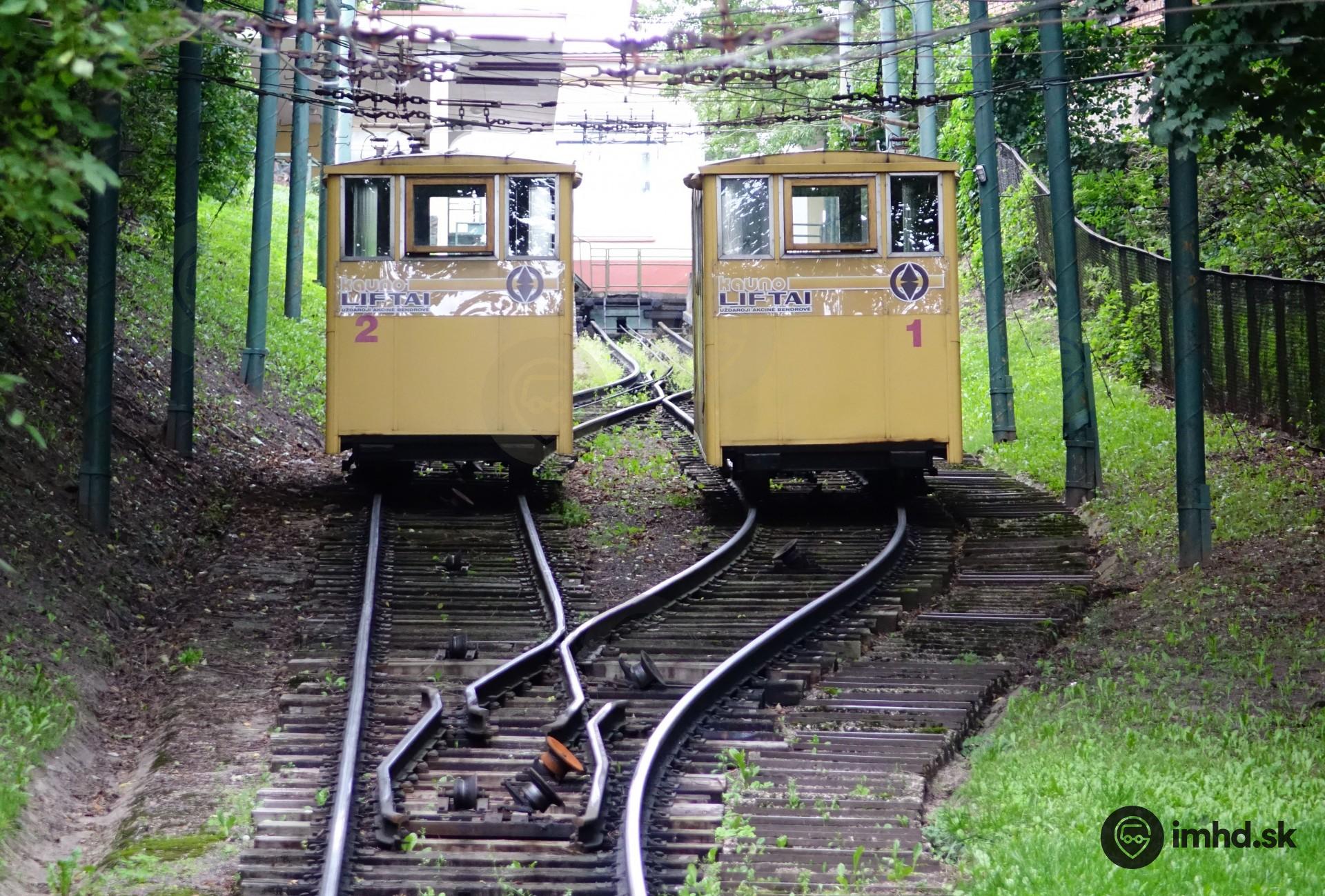 Vozne pozemnej lanovej dráhy Žaliakalnio funikulierius odstavené vo výhybni po skončení prevádzkových hodín. Pôvodne bol na lanovej dráhe inštalovaný iba jeden osobný vozeň a na opačnej strane lana bol zavesený iba podvozok s plošinou a protizávažím - kameňmi. V rokoch 1935 - 1937 boli vozne vymenené za nové, ktoré sú zobrazené na fotografii.