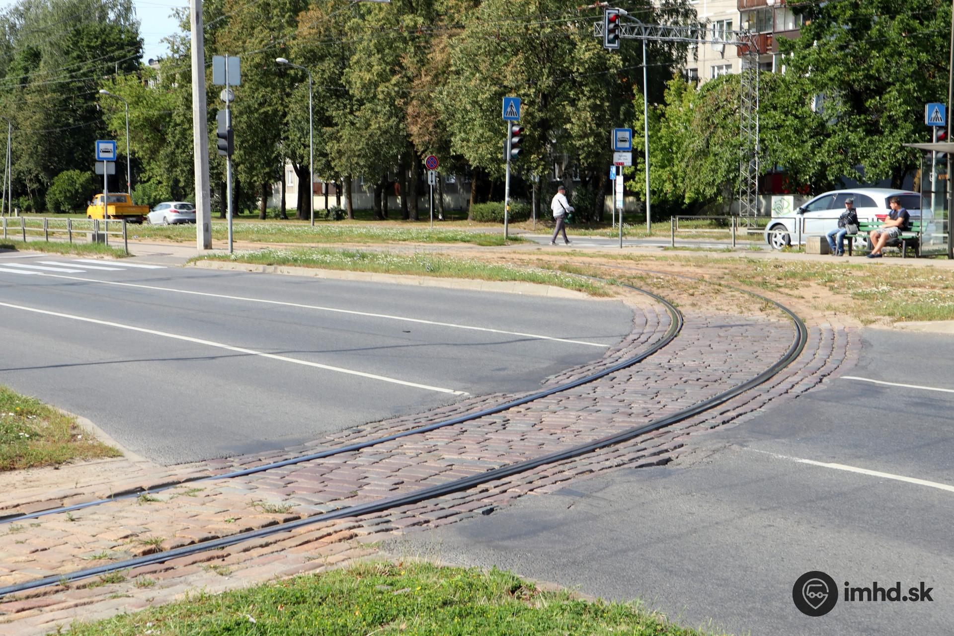 Pohľad na kríženie električkovej koľaje s cestou pri obratisku Eglaines iela / Dole. Pri návšteve Rigy sa nedá nevšimnúť veľká obľuba rôznych druhov dlažieb na povrchu električkových tratí - a to aj v mieste ich kríženia s cestou.
