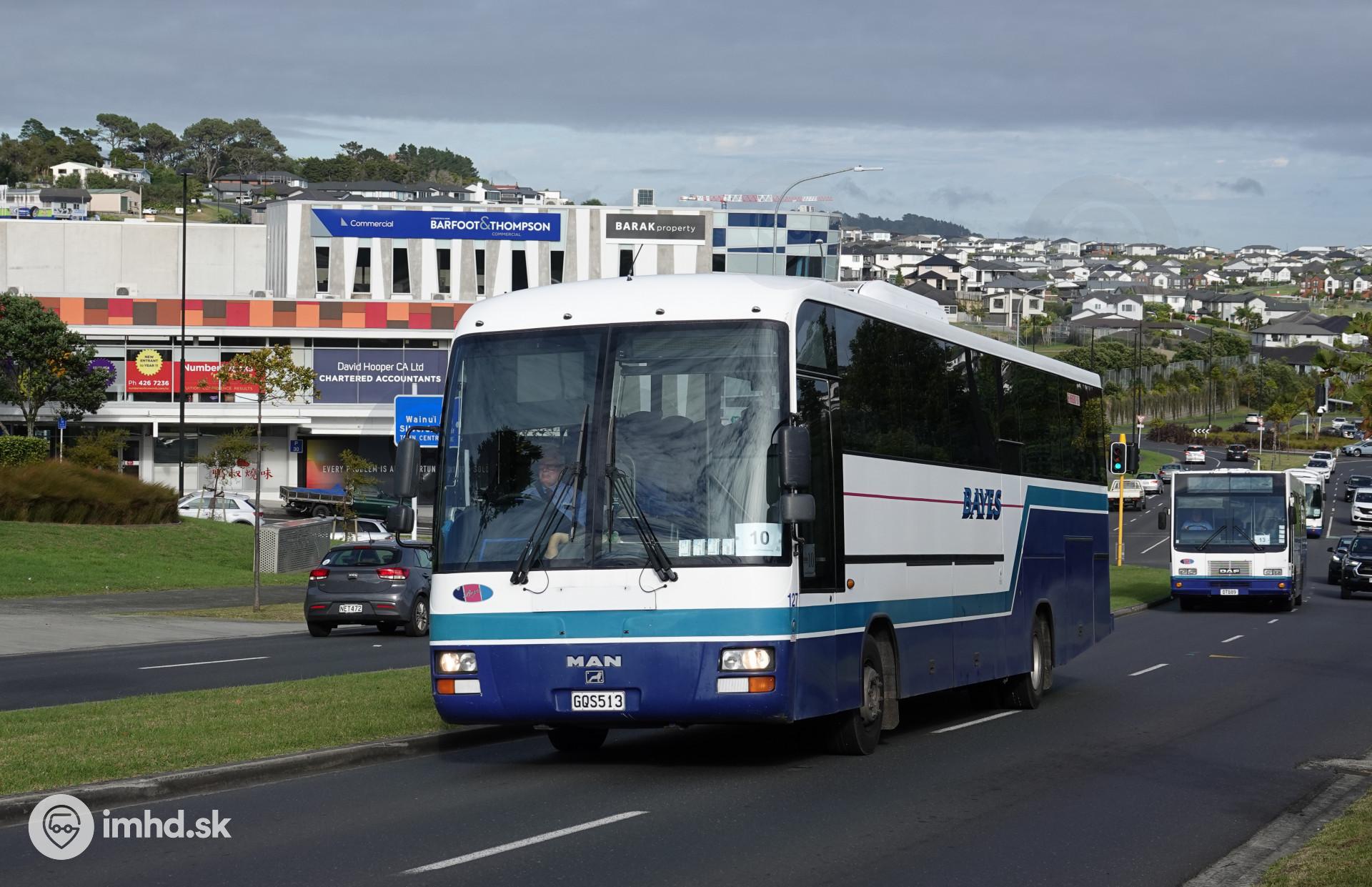 Flotila autobusov dopravila deti školského výletu na miesto určenia. Autobusy nie sú označené veľkým nápisom SCHOOL na prednom čele, čo je na novozélandské pomery netypické.