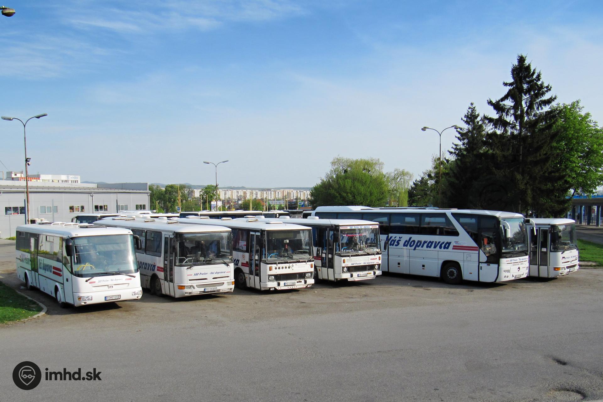 Čiastočný prierez vozidlovým parkom SAD Prešov v roku 2011 - SOR C 10.5 #PO-612DR, Karosy C 734 #PO-058BR, #PO-119BR, #PO-215BR, Mercedes-Benz O 350 Tourismo #PO-073BF a Karosa C 734 neznámeho EČV.