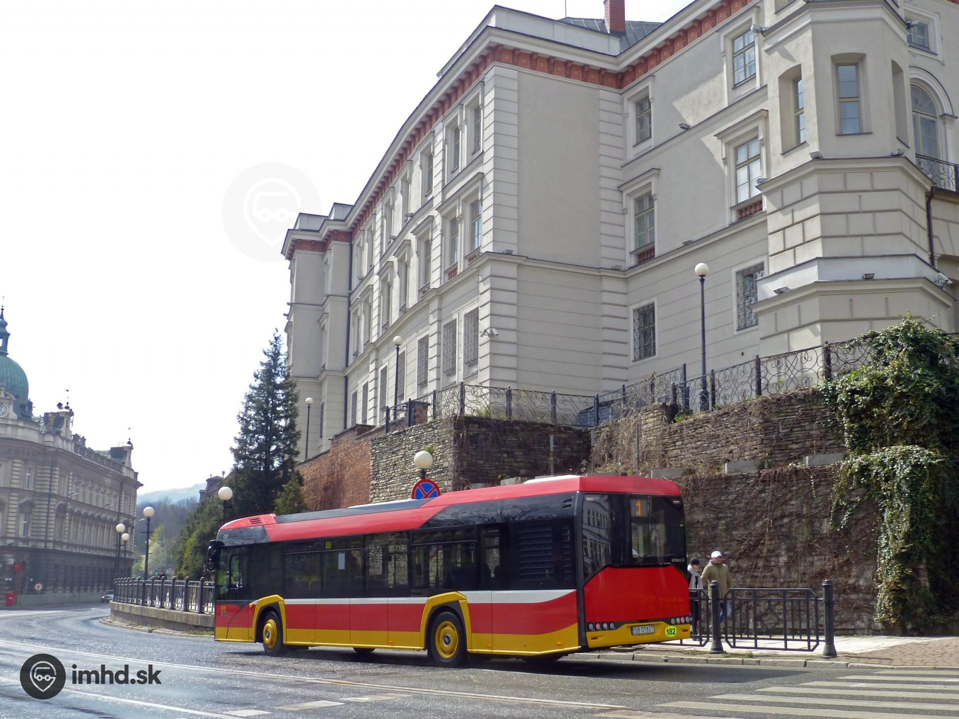 | Nový Solaris Urbino 12 IV #182 prechádza okolo budovy historického múzea. | |