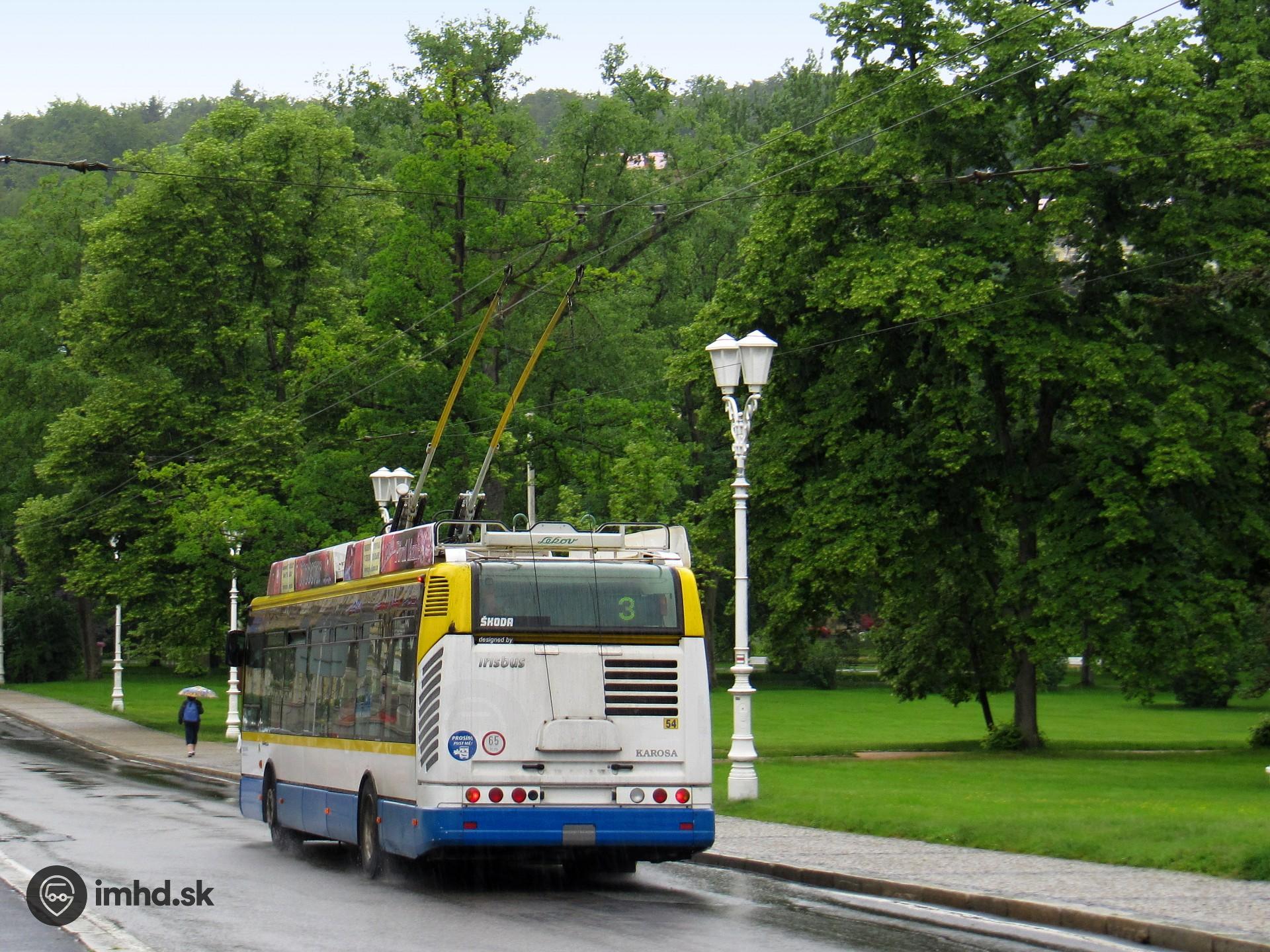 Škoda 24 Tr #54 prechádza okolo parku v centre mesta