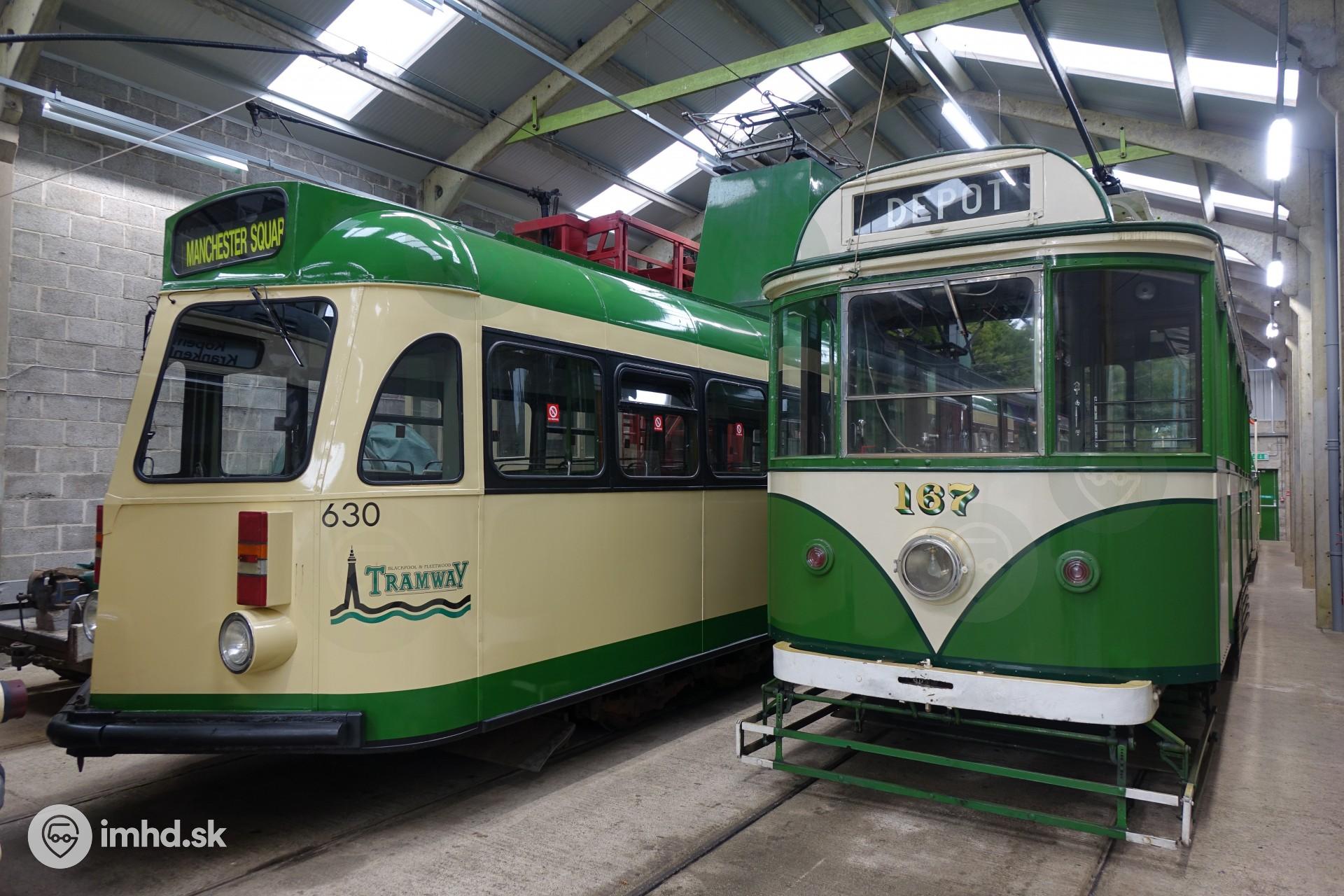 Blackpoolske električky v depe (Brush Co. #630 z roku 1937 a English Electric #167 z roku 1928)