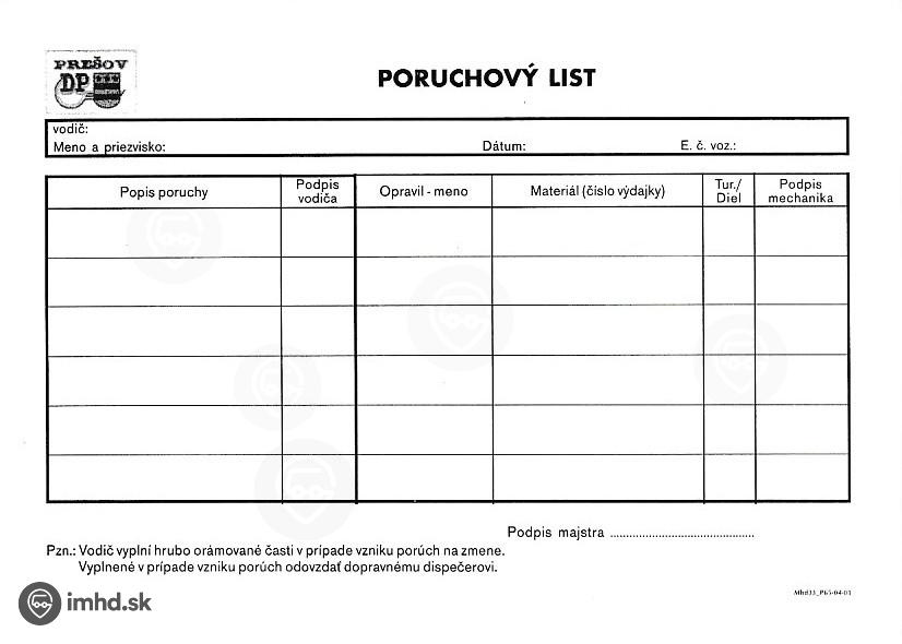 Tlačivo pre hlásenie porúch na vozidle.