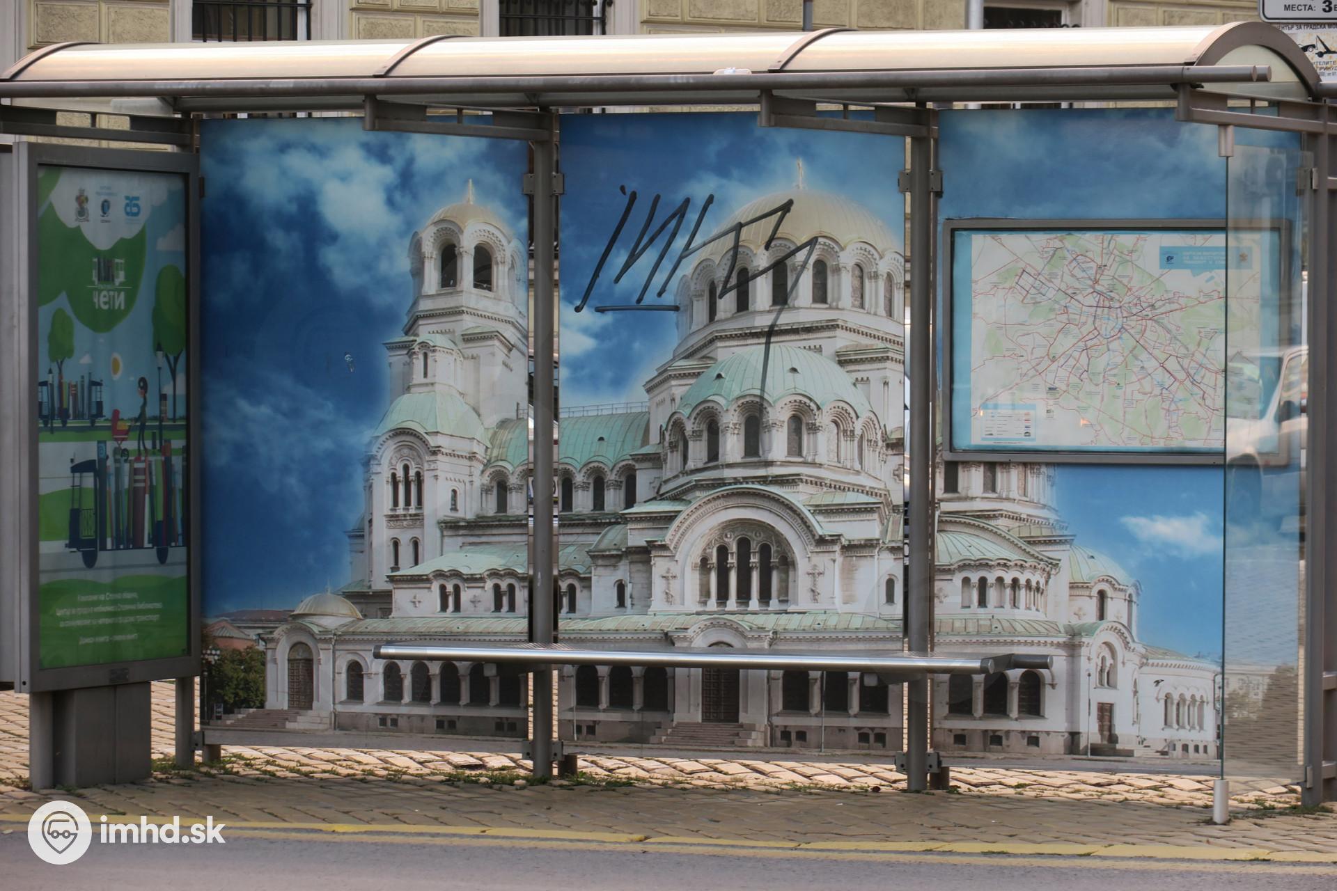Zastávkový prístrešok s polepom s Chrámom svätého Alexandra Nevského, ktorý sa nachádza 200 metrov za prístreškom.