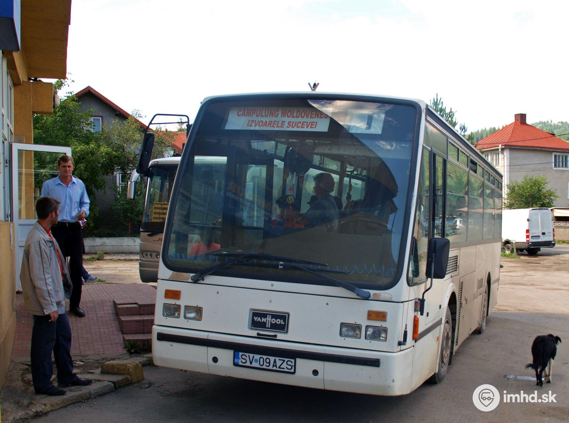 Midibus Van Hool A308 na autobusovej stanici. K rumunskej stanici neodmysliteľne patrí aj túlavý pes.