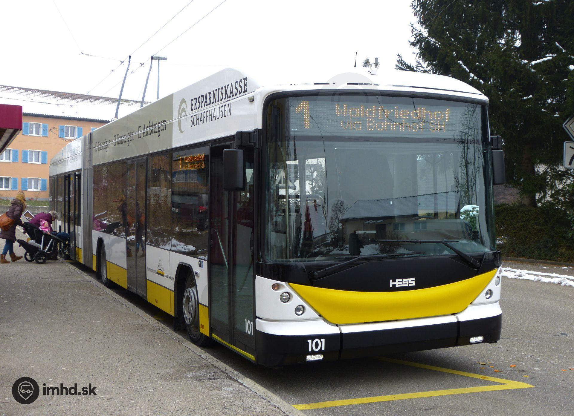 Hess Swisstrolley 3 na konečnej. Vodič je v sociálnom zariadení, zatiaľ čo cestujúci môžu nastúpiť do teplého trolejbusu.