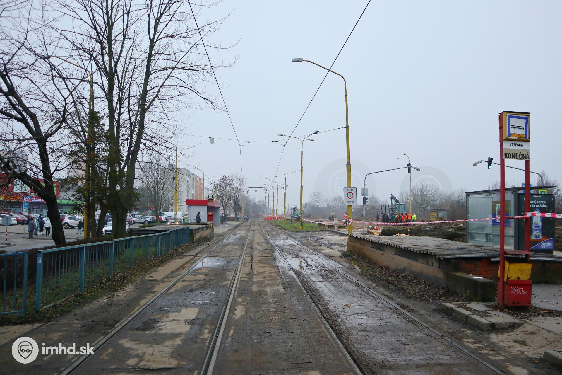 Uzavretá električková trať počas výrubu stromov pri zastávke Važecká.
