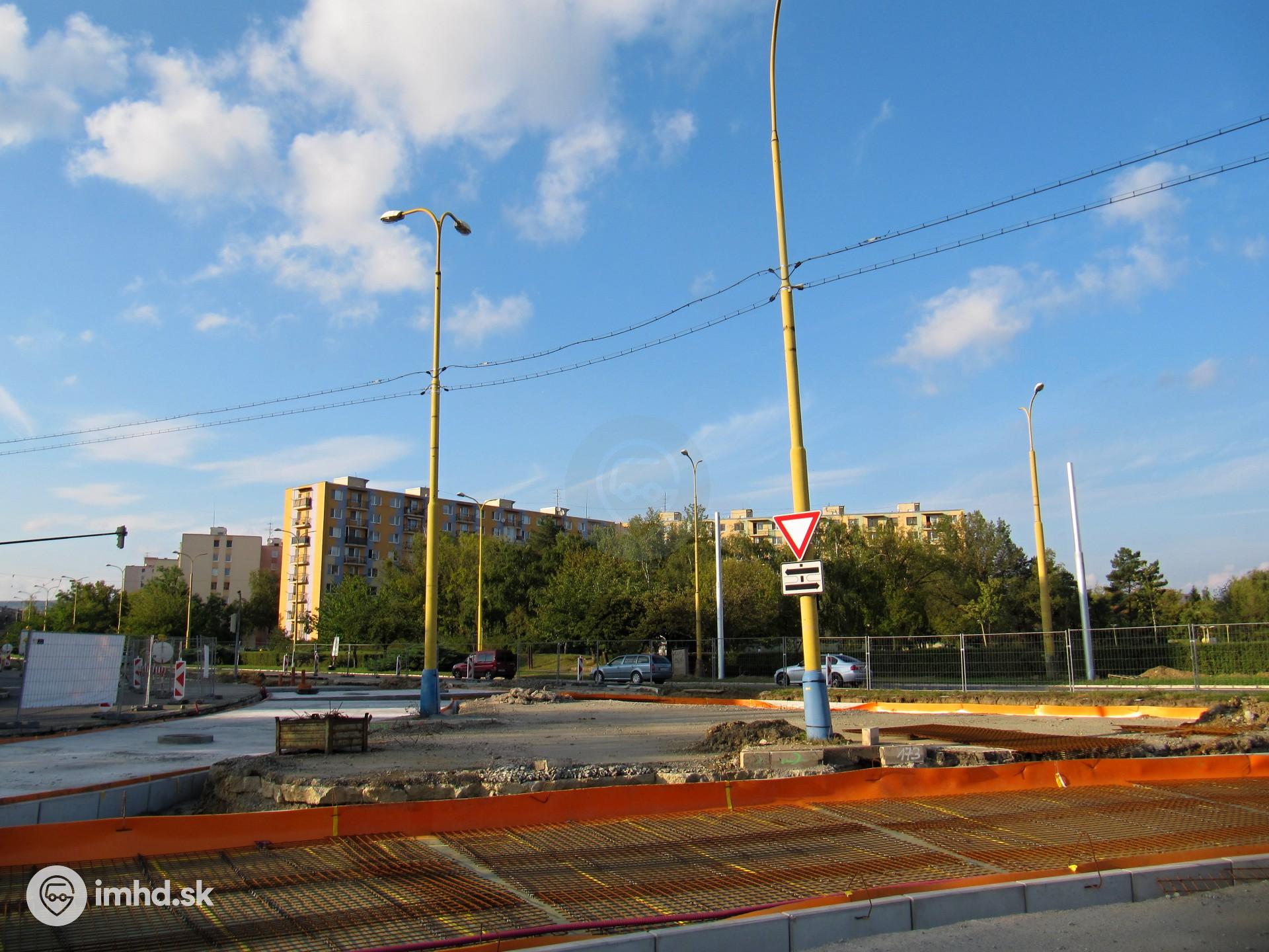 Pohľad na rozpracované lôžko električkovej trate v križovatke.