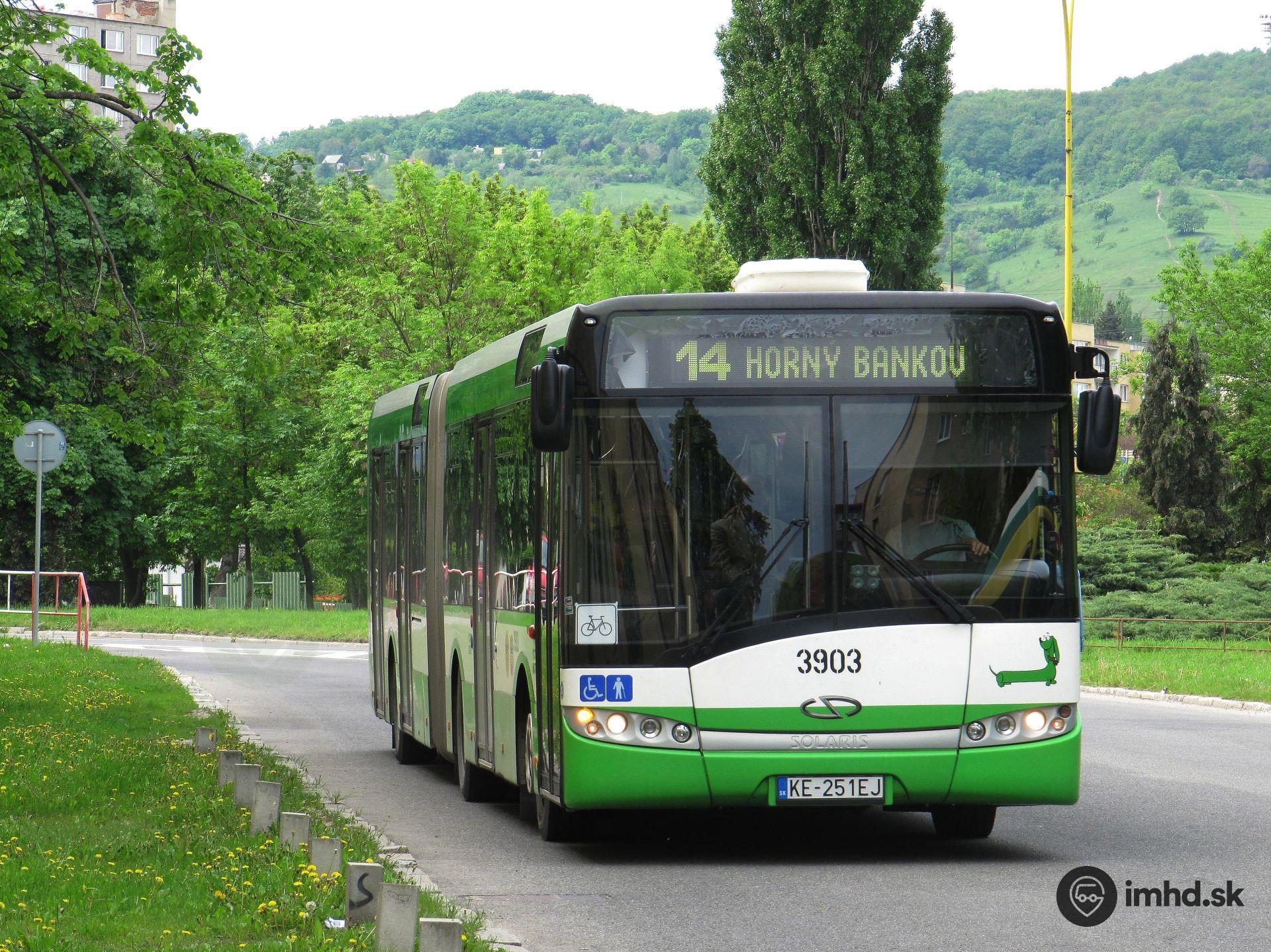 Solaris Urbino 18 III #3903 prichádza do zastávky Vodárenská. Symbol bicykla za čelným sklom znamená, že aj v tomto spoji na linke 14 je možný prevoz bicyklov.