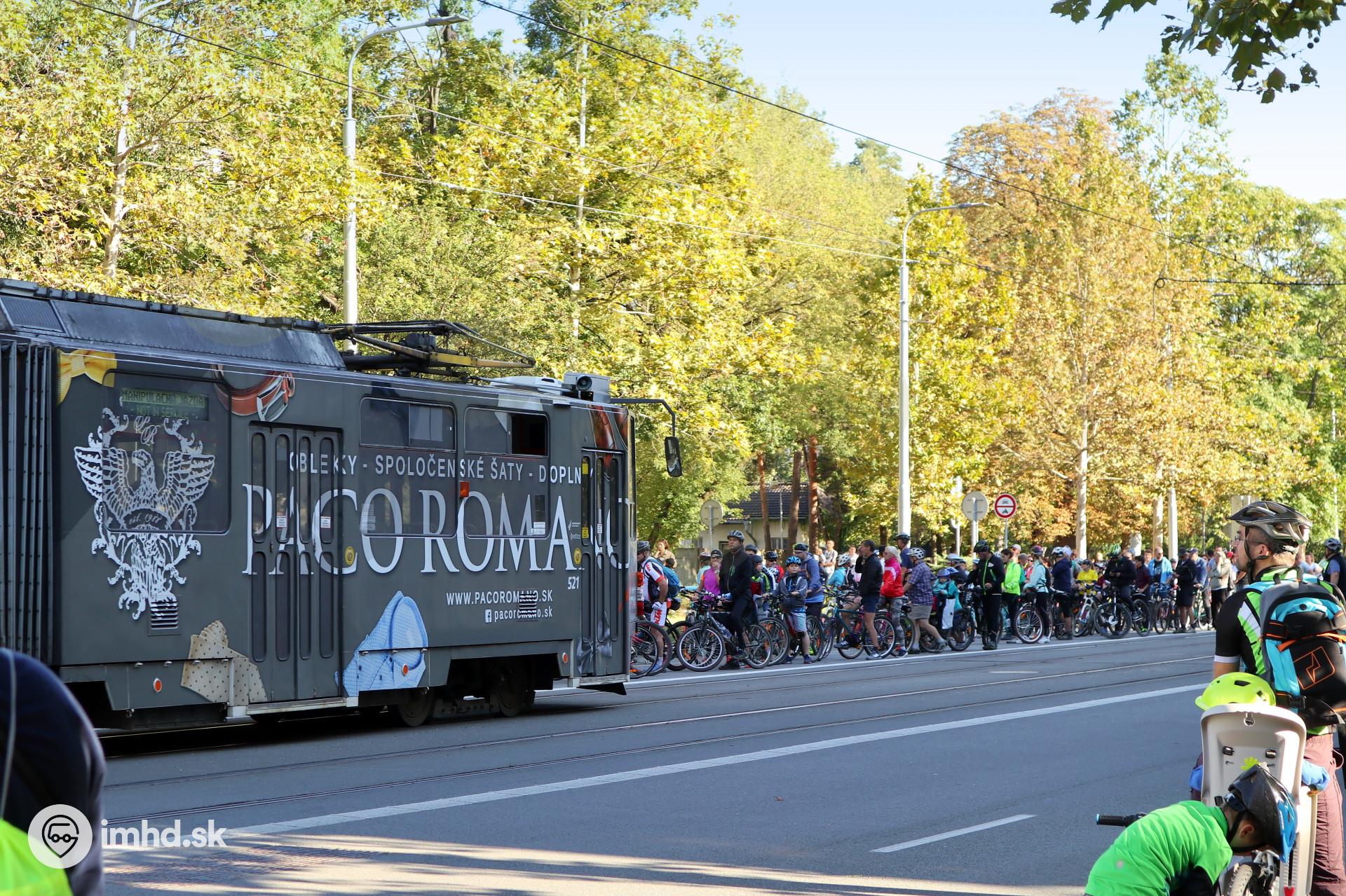 #521 prechádza okolo zástupu cyklistov pred štartom Polmaratónskej cyklojazdy