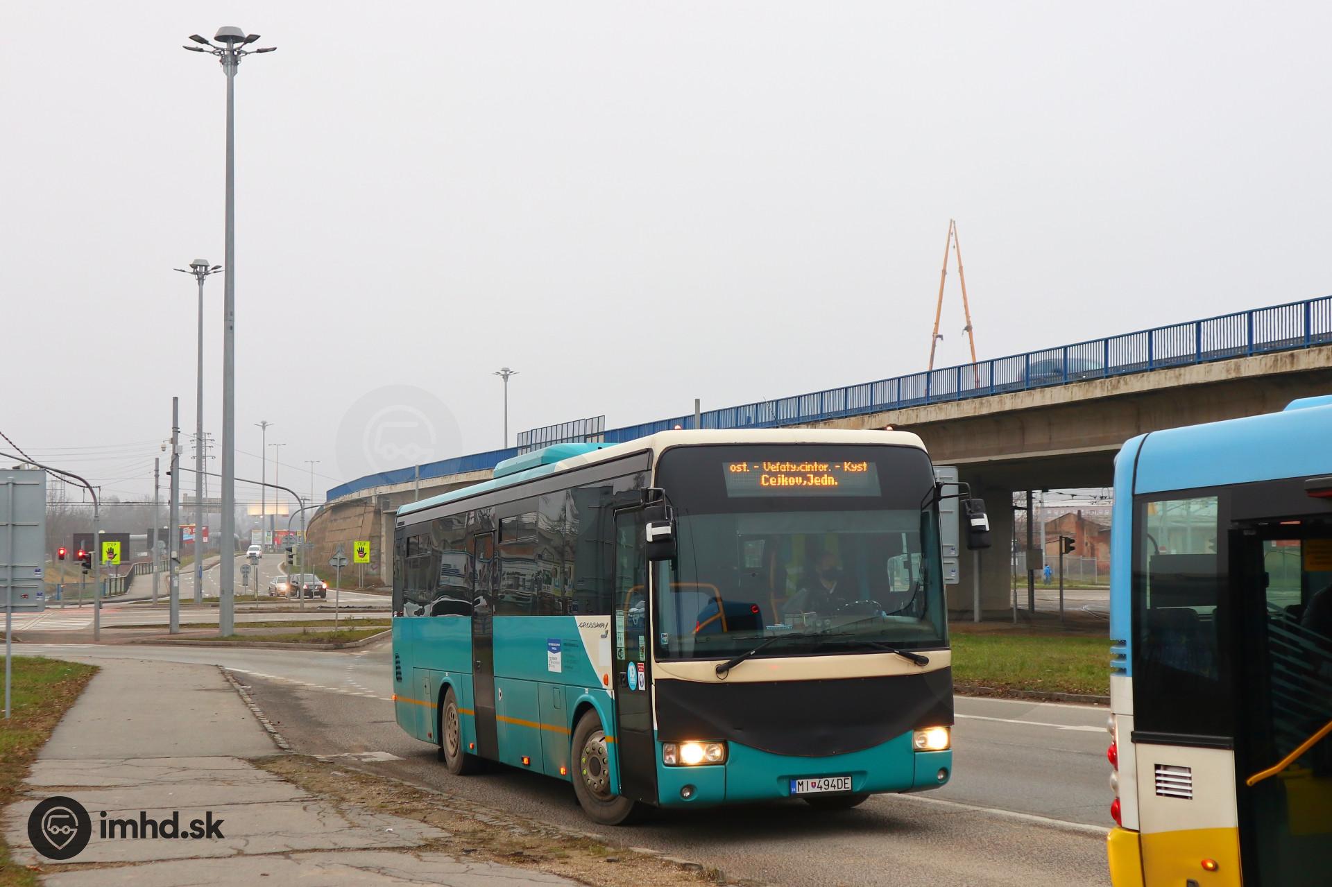 Irisbus Crossway 10.6M #MI-494DE zastavila na zastávke VSS, križovatka cestou do Cejkova