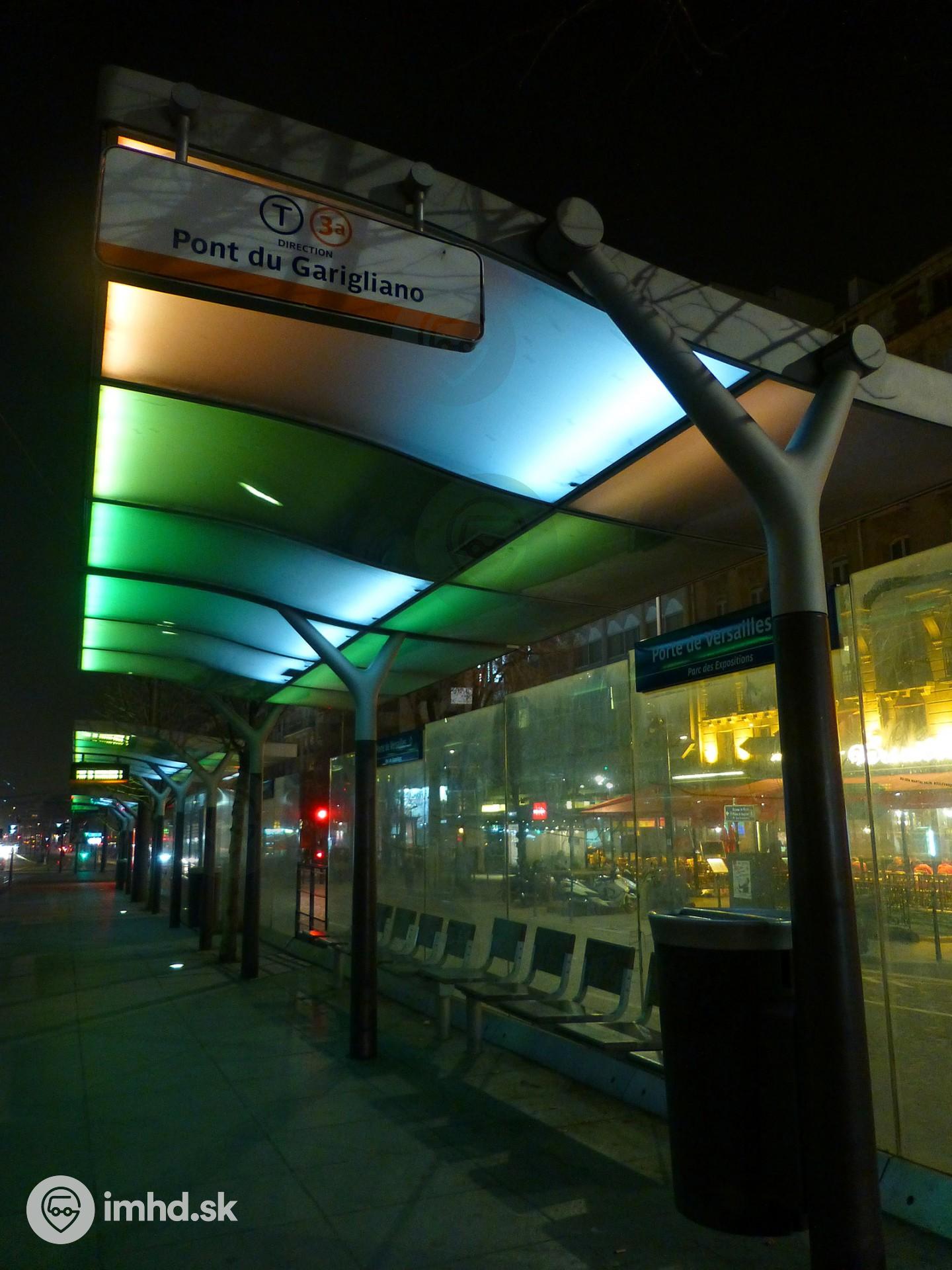 Podsvietený zastávkový prístrešok meniaci farby na zastávke električky T3A Porte de Versailles.
