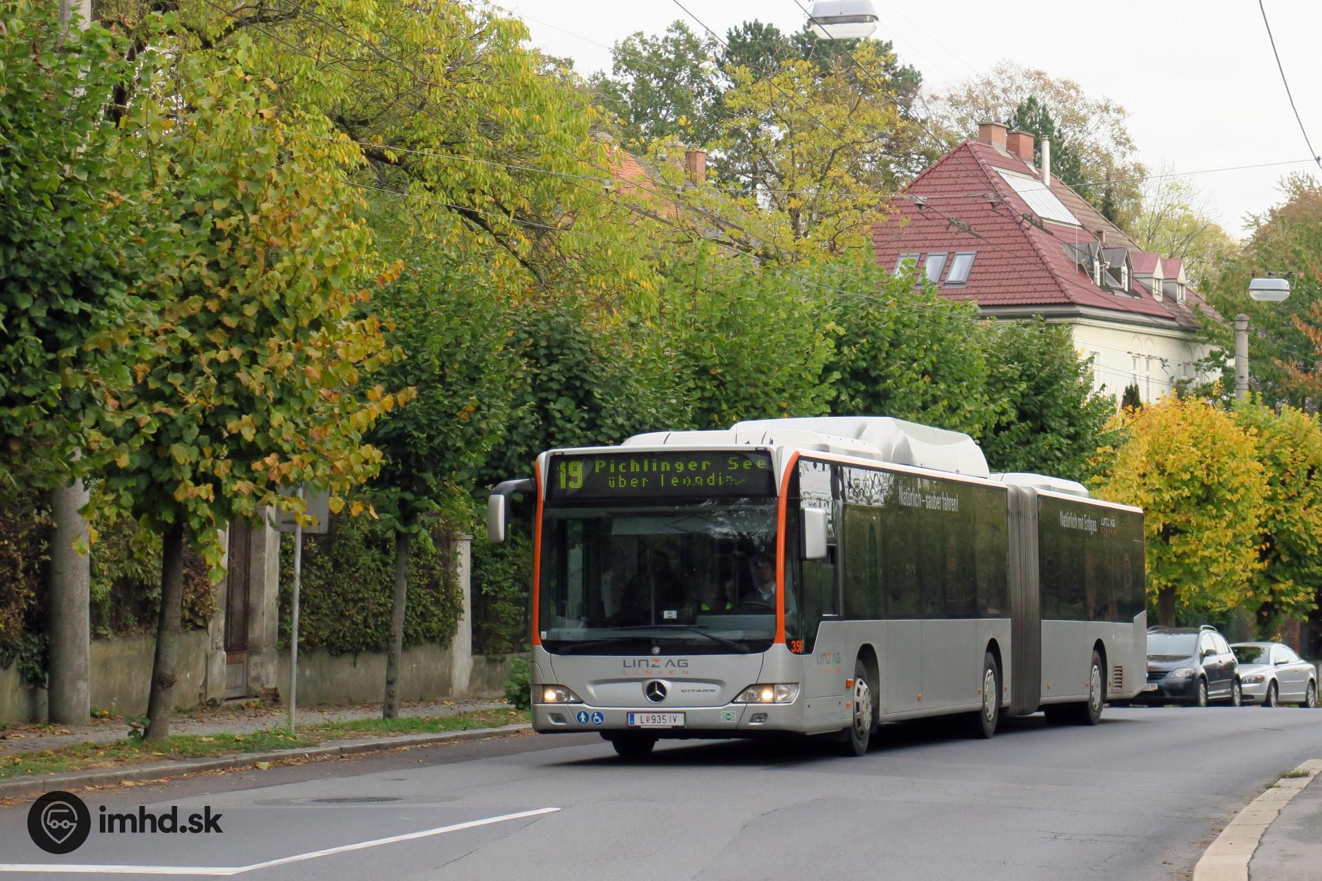 Mercedes-Benz Citaro II G CNG #356 prechádza predmestím Linzu Froschberg, plným zelene.