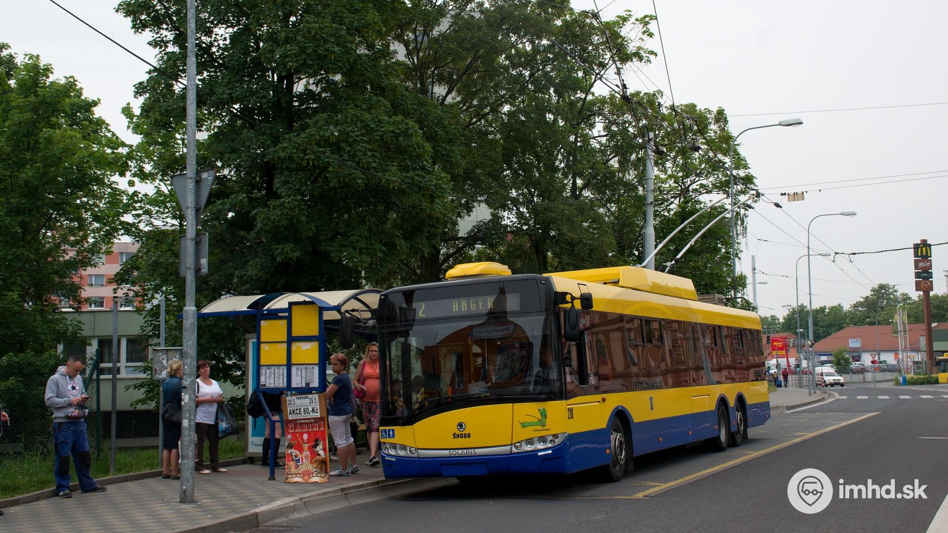 Arriva Teplice prevádzkuje 7 trolejbusov Škoda 28 Tr Solaris. Jeden z nich čaká na nástup cestujúcich na zastávke Trnovany, Policie ČR.
