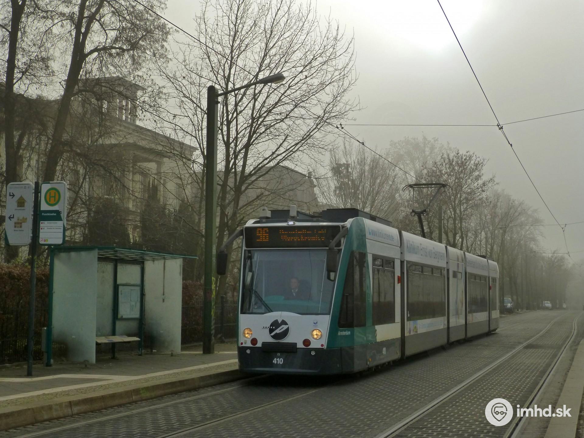 Električka Siemens Combino #410 "Amsterdam" na zastávke Puschkinallee.