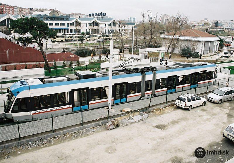 Električka Bombardier Flexity Swift #747 na konečnej v prestupnom uzle Zeytinburnu. Do Istanbulu bolo v rokoch 2002 - 2004 dodaných 55 takýchto nízkopodlažných klimatizovaných električiek dlhých 29,7 m.