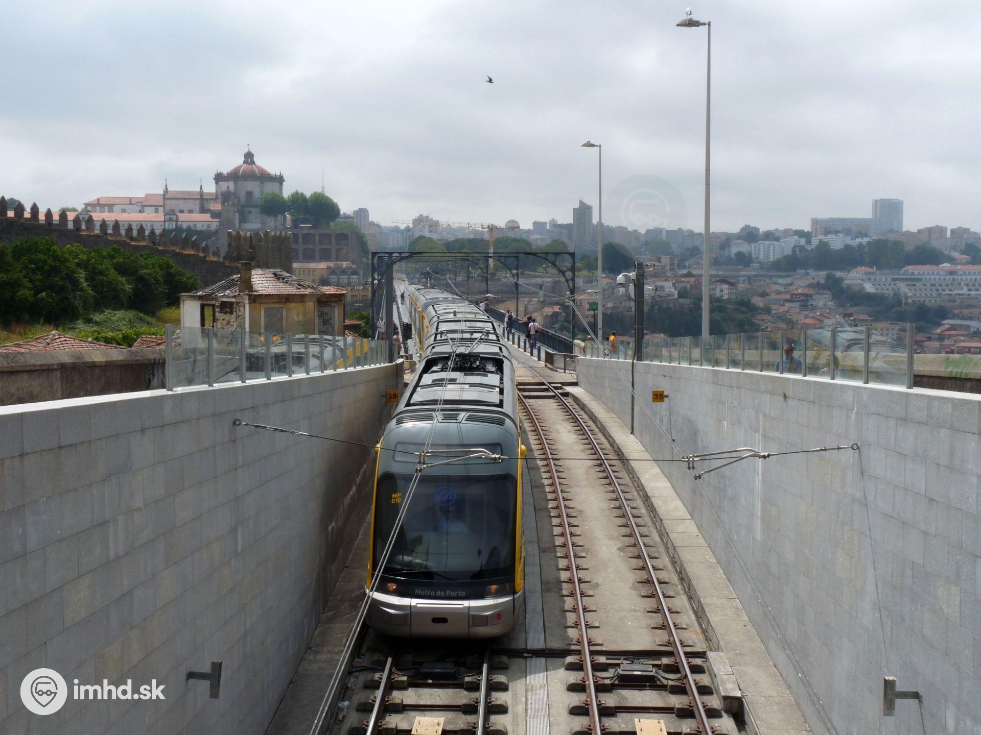Súprava električiek Eurotram Flexity Outlook vchádza z mosta Ponte Luís I priamo do podzemnej časti siete Metro do Porto.