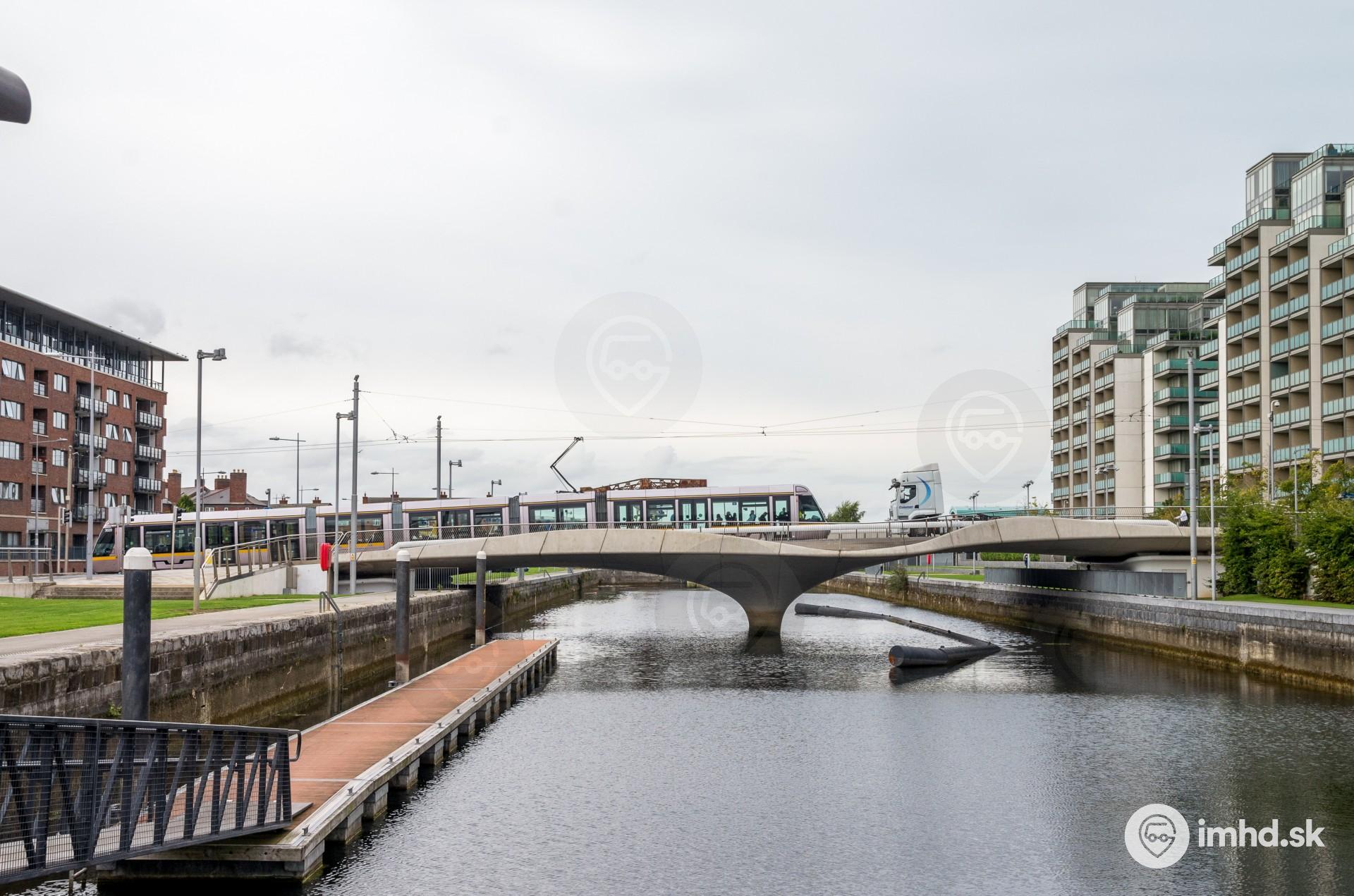 Stretnutie električky a kamiónu na moste v širšom centre Dublinu.