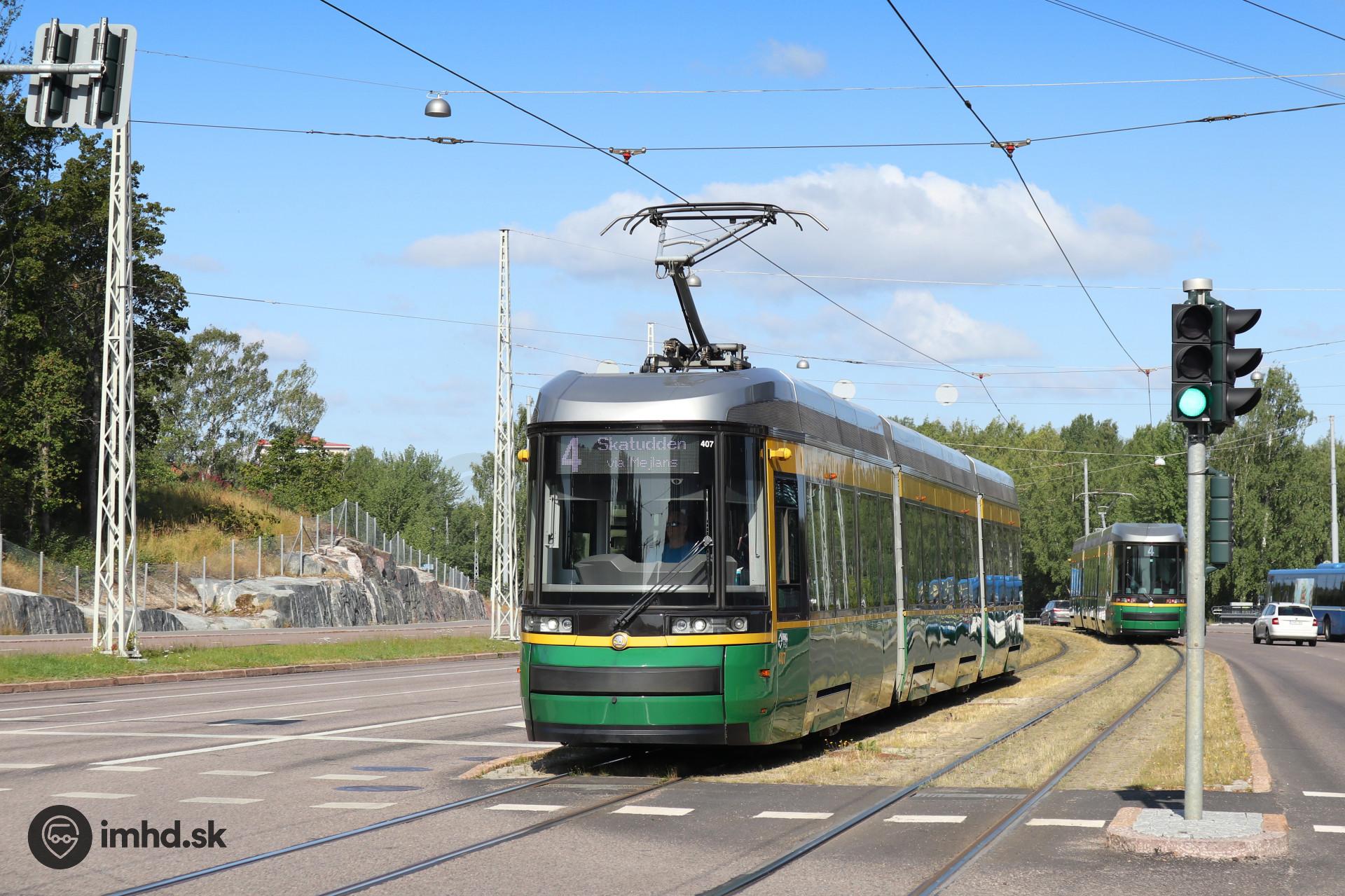 Transtech MLRV01 Artic #407 prichádza k zastávke Paciuksenkaari