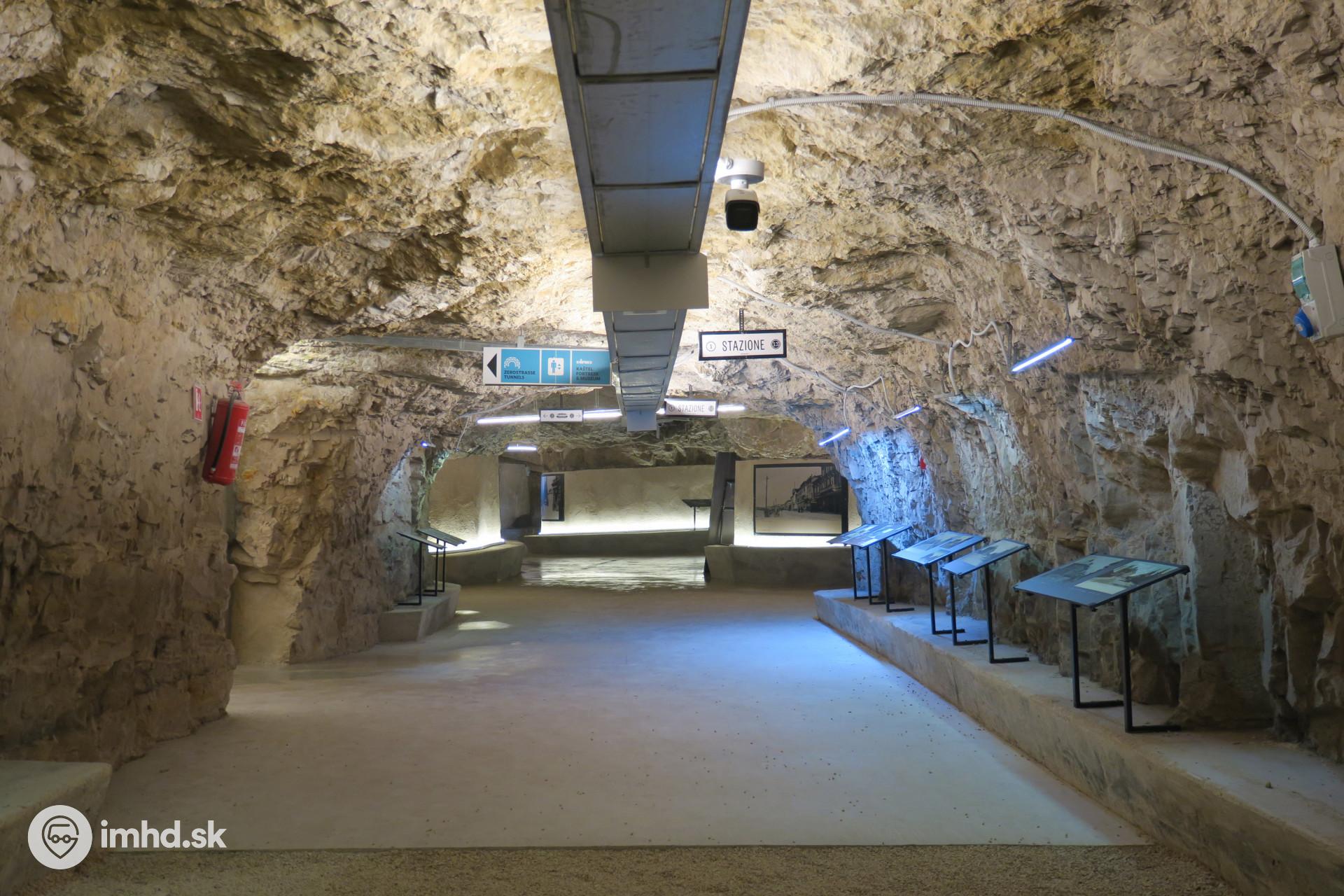Pohľad na tunel s výstavou o električkovej doprave. V odbočke vľavo sa nachádza výťah, umožňujúci prístup priamo do pevnosti.