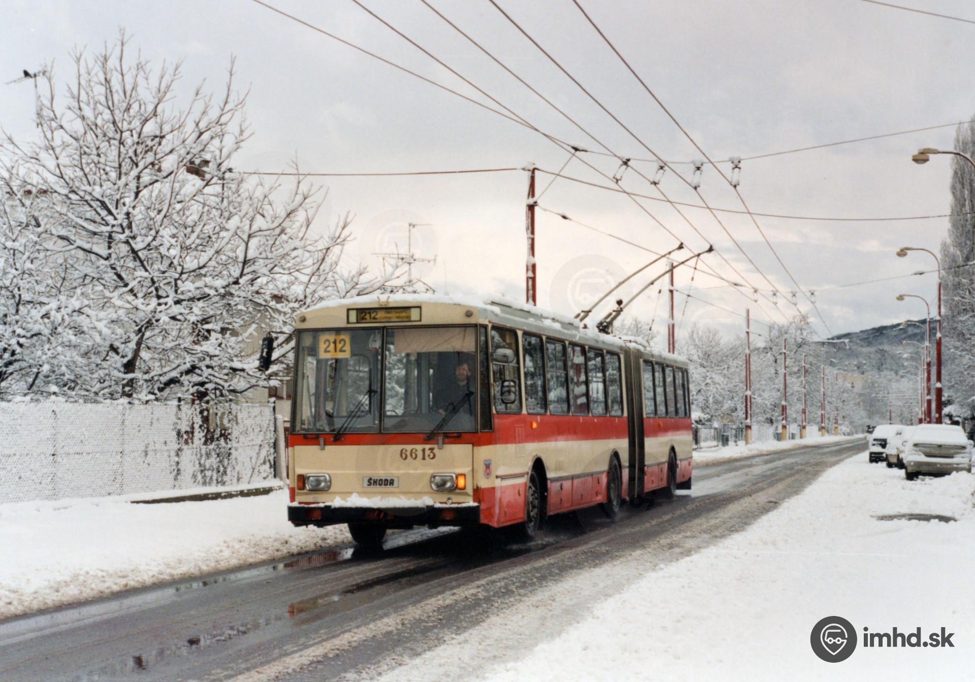 Škoda 15 Tr #6613 na zasneženej ulici Pri Suchom mlyne.