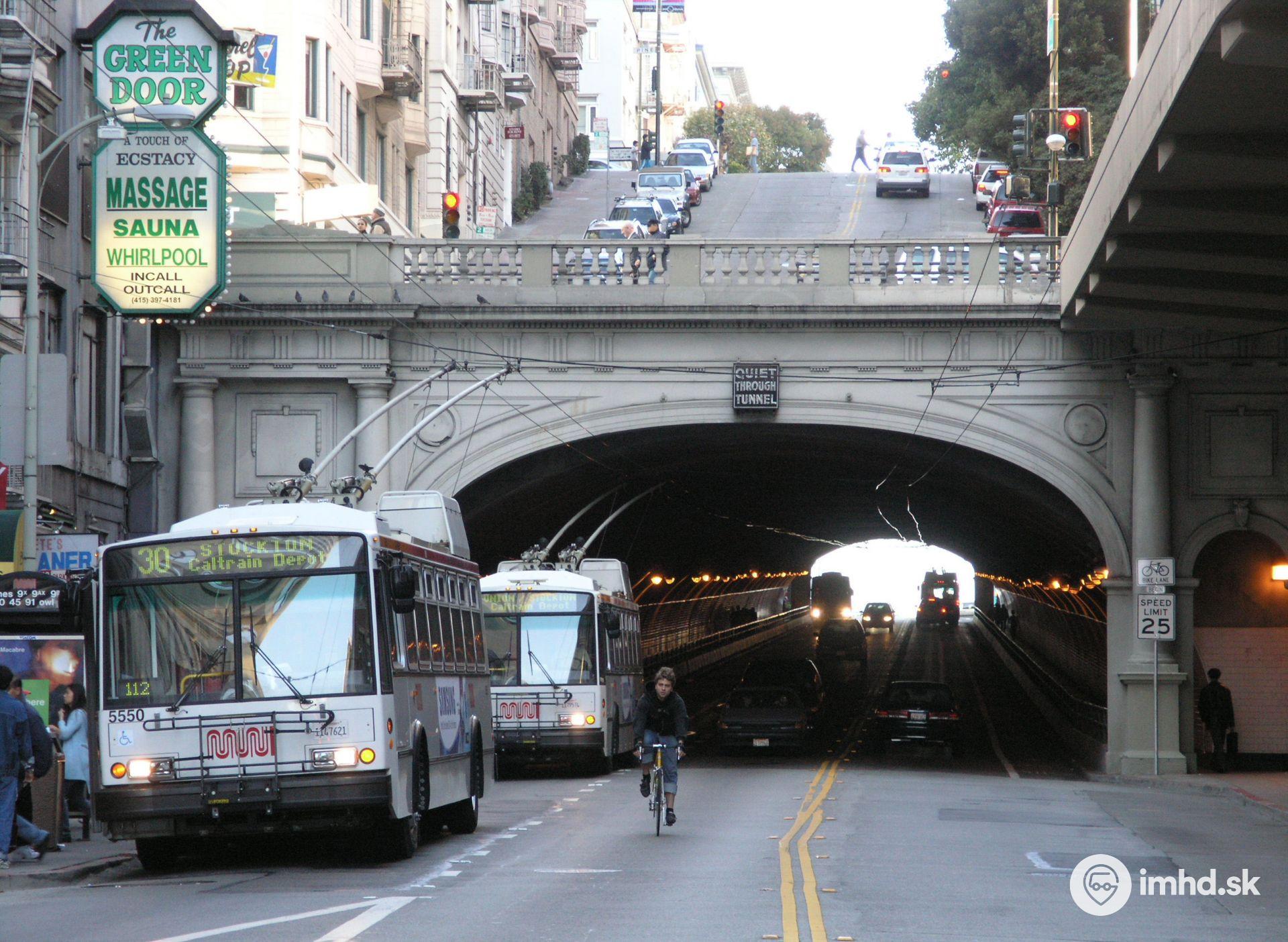 ETI Škoda 14TrSF #5550 po východe zo Stockton Tunnelu. Tento tunel pôvodne slúžil pre električky.